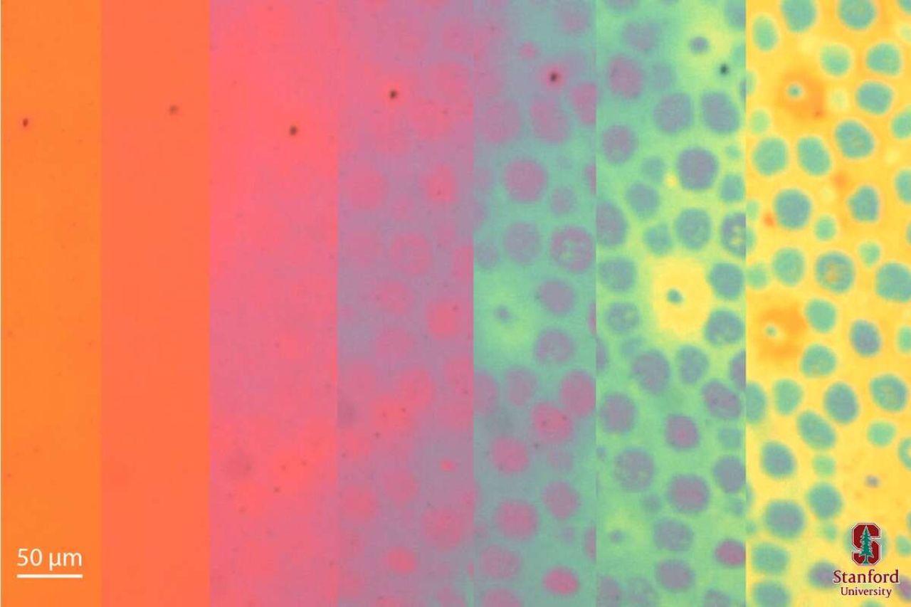 Il team ha dimostrato che «La stessa tecnica può essere utilizzata per progettare e rivelare pattern di colori complessi e commutabili». I ricercatori hanno applicato sottili strati metallici su ciascun lato del film polimerico modellato per creare risonatori Fabry-Pérot, che isolano specifiche lunghezze d'onda della luce in base alla distanza tra gli strati metallici. Man mano che i film polimerici si gonfiano fino a raggiungere diverse larghezze, mostrano una varietà di colori. Con la stessa modellazione a fascio di elettroni e la giusta miscela di acqua e solvente, il foglio monocromatico diventa un tripudio di punti e chiazze colorate.