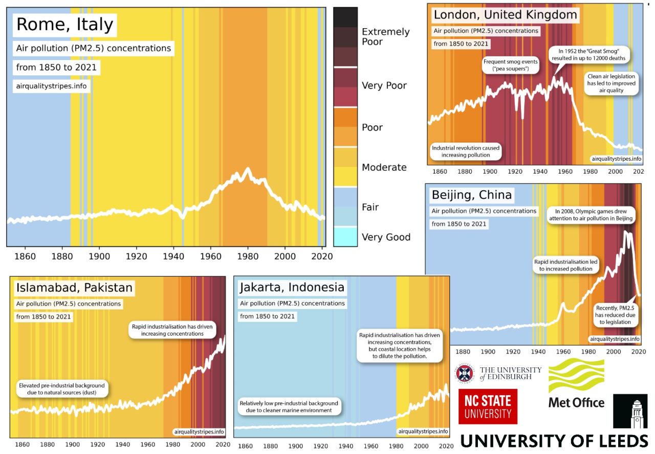 Le Air Quality Stripes, create dall'università di Leeds, dall'università di Edimburgo, dalla North Carolina State University e dal Met Office del Regno Unito, evidenziano i significativi miglioramenti della qualità dell'aria in gran parte d'Europa in contrasto con il preoccupante deterioramento in alcune parti dell'Africa e dell'Asia centrale. I risultati del progetto evidenziano sia i successi sia le sfide attuali nella lotta all'inquinamento atmosferico in tutto il mondo.