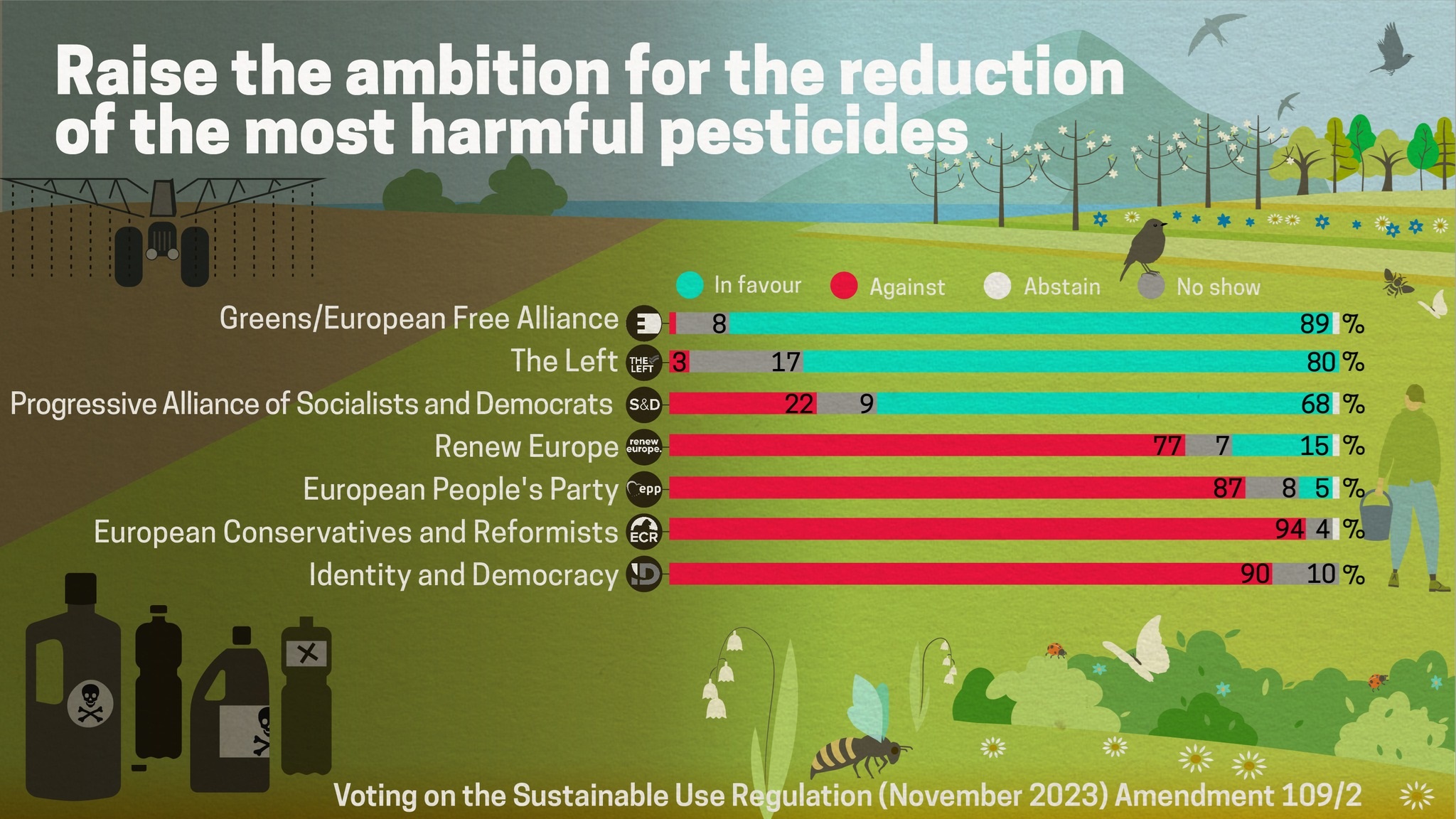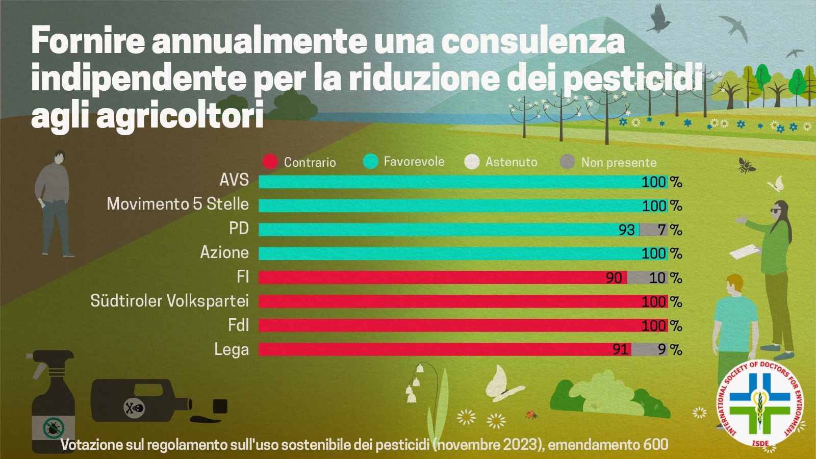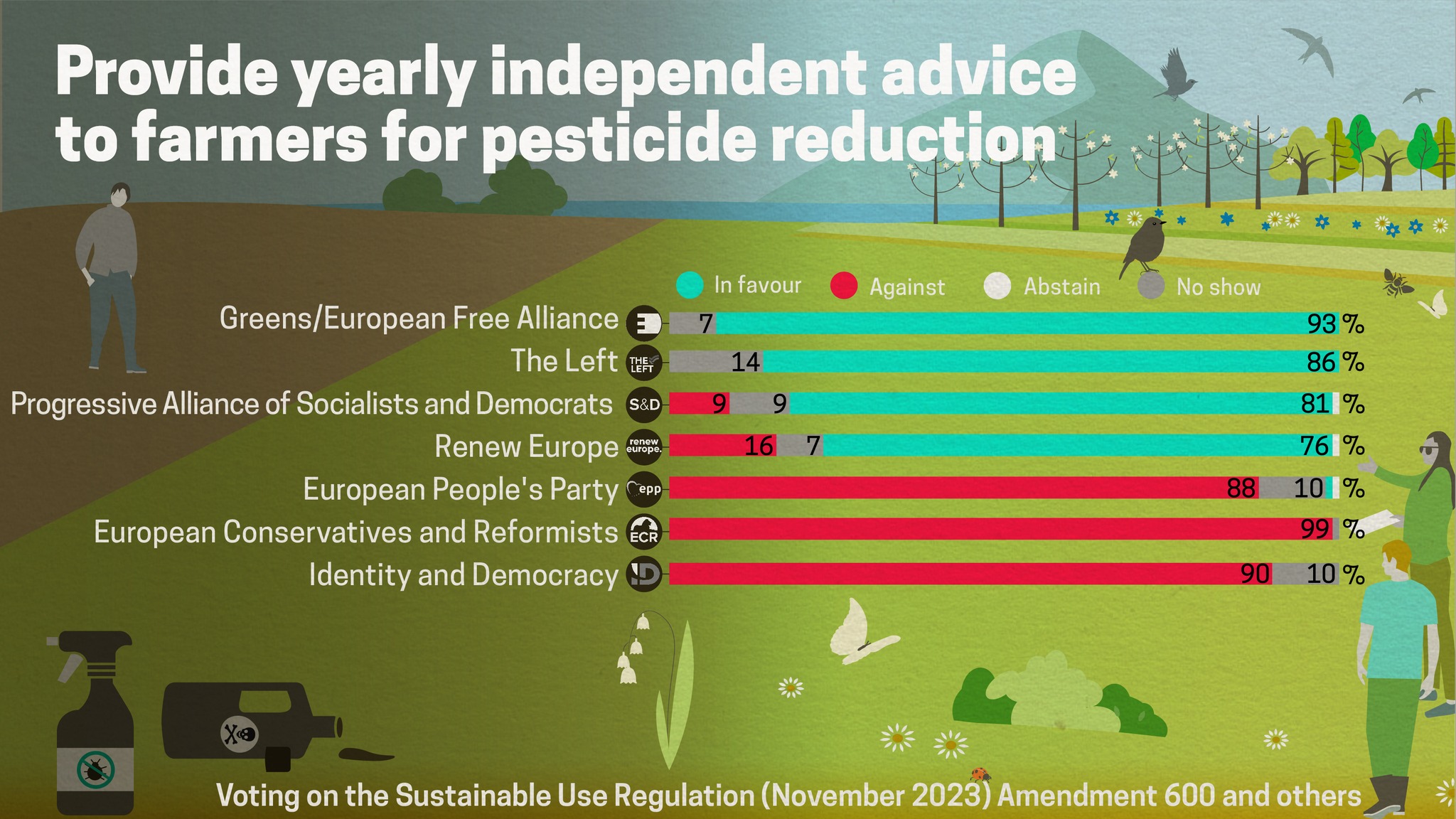 PAN Europe (Pesticide Action Network) e Friends of the Earth Europe spiegano che «Le 6 schede di valutazione mostrano quali gruppi politici ha votato per ridurre efficacemente i pesticidi. Chi ha votato per tutelare cittadini, ecosistemi e agricoltori? Chi ha attivamente minato le misure urgenti? L'analisi mostra che la maggioranza dei gruppi politici cristiano-democratici (PPE, di cui fa parte Forza Italia), conservatori di estrema destra (ECR, di cui fa parte Fratelli d’Italia) e l’ estrema destra sovranista (ID di cui fa parte la Lega ex nord) hanno votato coerentemente contro l'interesse pubblico».