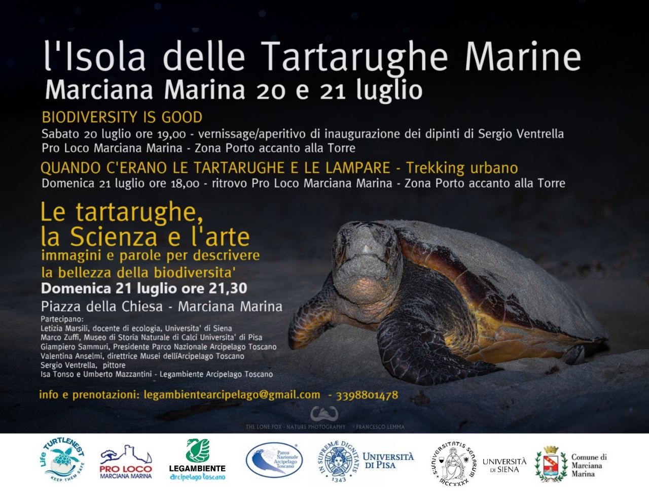 Infatti alla serata condotta da Umberto Mazzantini, responsabile mare di Legambiente Toscana, parteciperanno: Letizia Marsili, docente di ecologia, Università di Siena, che parlerà de “La nuova vita di una tartaruga marina che ha pinneggiato dal Paleozoico all'Antropocene”; Marco Zuffi, erpetologo del Museo di Storia Naturale di Calci dell’ Università di Pisa che affronterà l’attualissimo tema "Tartarughe marine in espansione a nord. Cosa succede in Arcipelago e Toscana settentrionale?"; Giampiero Sammuri, Presidente Parco Nazionale Arcipelago Toscano, che illustrerà il ruolo del parco nella salvaguardia delle tartarughe marine; Valentina Anselmi, direttrice del Sistema museale dell’Arcipelago Toscano e Sergio Ventrella, pittore, che parleranno di come l’arte può descrivere la ricchezza della biodiversità