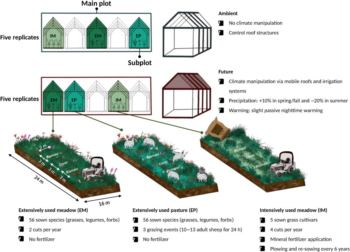 Nei prati e pascoli del GCEF utilizzati meno intensivamente cresceva un mix eterogeneo di oltre 50 erbe e piante aromatiche autoctone; nei pascoli utilizzati intensivamente il team UFZ aveva seminato solo le 5 varietà di erbe raccomandate agli agricoltori dall'Istituto statale per l'agricoltura e l'orticoltura della Sassonia-Anhalt per i siti più asciutti all'inizio dell'esperimento. Tra queste c'erano varietà di dattile conosciuta anche come erba mazzolina e pannocchina erba dei prati (Dactylis glomerata) e loietto perenne (Lolium perenne) che vengono coltivate per la massima resa e che vengono anche pesantemente fertilizzate, come è comune nella pratica agricola. Inizialmente, i prati intensivi erano molto più produttivi delle praterie più diversificate ma sono stati in grado di sfruttare questo vantaggio solo in condizioni climatiche favorevoli e non hanno resistito alla siccità così come le piante nei prati e nei pascoli a bassa intensità.
