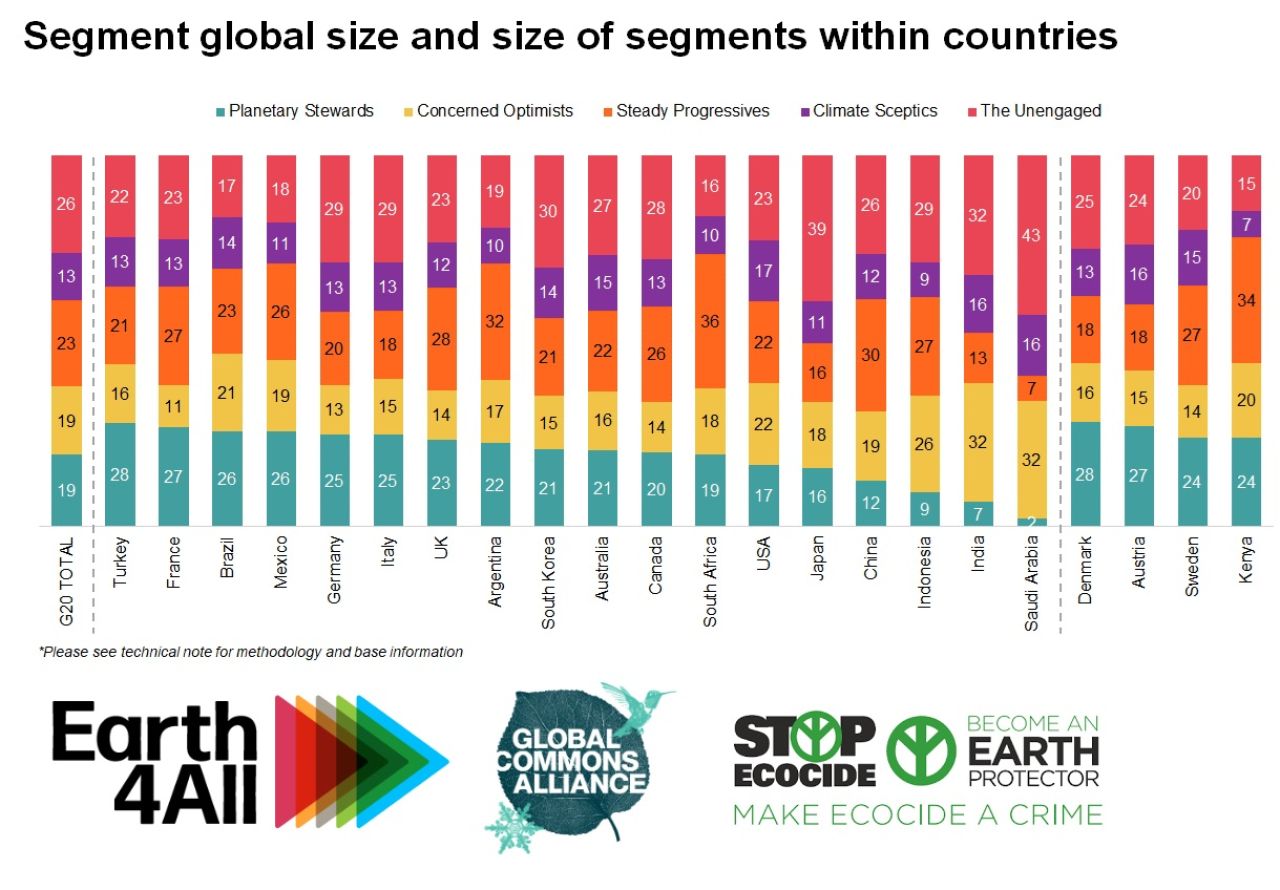 All'interno dei Paesi del G20 intervistati, i Guardiani del pianeta costituiscono il gruppo più numeroso in Turchia (28%), Francia (27% - gruppo più numeroso insieme ai Progressisti costanti), Brasile (26%) e Messico (26% - gruppo più numeroso insieme ai Progressisti costanti). I disimpegnati costituiscono i gruppi più numerosi in Germania, Italia, Giappone e Arabia Saudita. In tutto il G20, secondo i risultati del sondaggio, solo il 13% delle persone rientra nel gruppo degli scettici del clima.