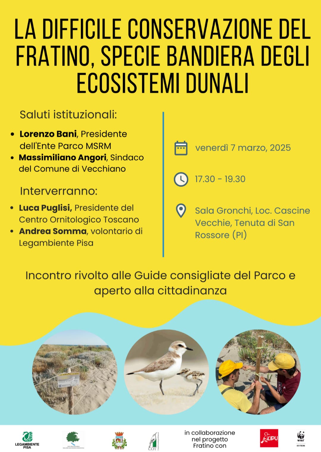 Per raccontare tutto questo e di più, le associazioni ambientaliste insieme al Centro Ornitologico Toscano, organizzano per il prossimo venerdì 7 marzo, dalle 17.30 alle 19.30, presso la Sala Gronchi nella Tenuta di San Rossore a Cascine Vecchie, un seminario per divulgare l’importanza del Fratino e degli ambienti dunali sul nostro litorale e raccontare al pubblico le azioni di conservazione attiva nei confronti di questa specie. Tutta la cittadinanza è invitata a partecipare.