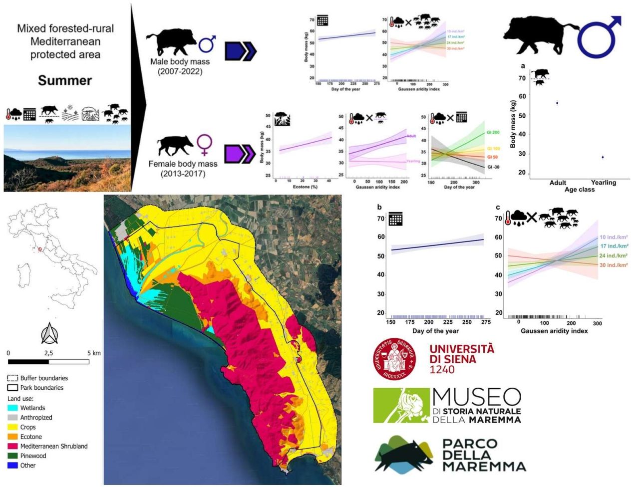 Lo studio “Starving or Stuffing? Plasticity in Wild Boar Body Mass Variations During Summer in a Mediterranean Area”, pubblicato su Integrative Zoology da Martina Calosi, Niccolò Fattorini e Francesco Ferretti del Dipartimento scienze della vita dell’università di Siena, Andrea Sforzi del Museo di storia naturale della Maremma e Luca Tonini dell’ente Parco regionale della Maremma, ha analizzato le variazioni estive della massa corporea dei cinghiali nel Parco regionale della Maremma, in un'area protetta mediterranea mista forestale-rurale, dove le condizioni climatiche caldo-secche rendono l’estate particolarmente limitante per gli ungulati selvatici.