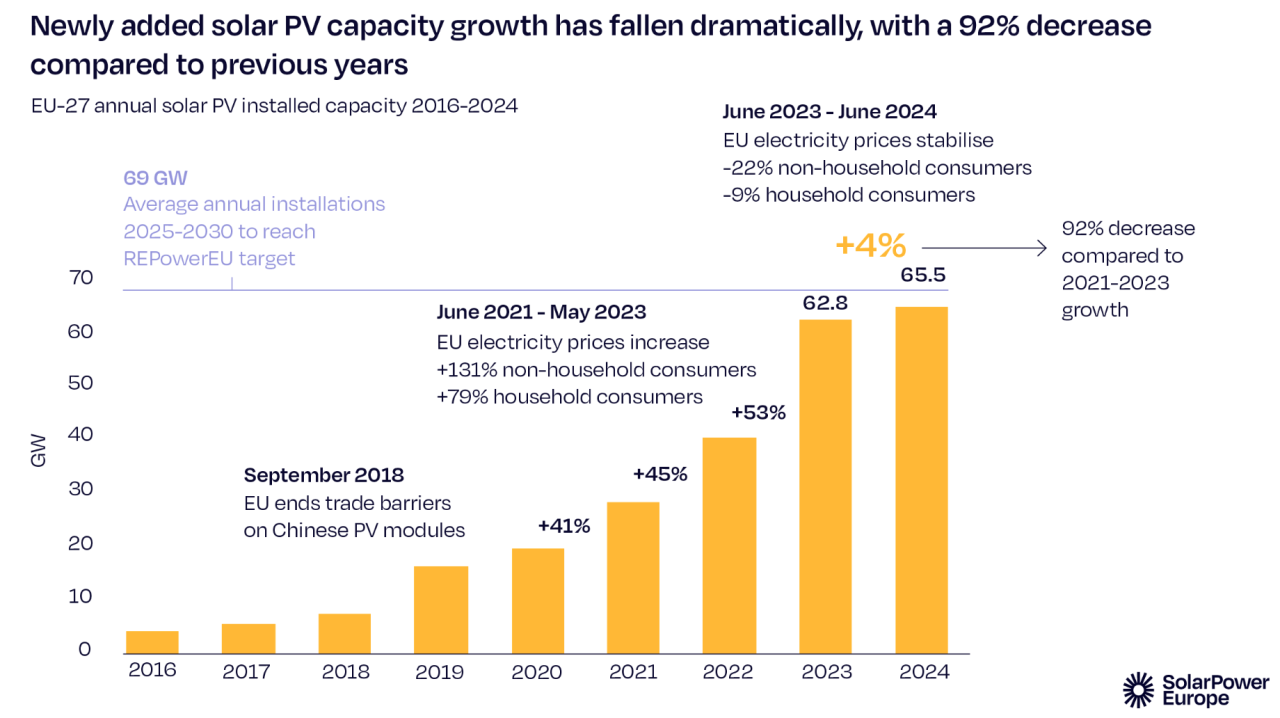 Dopo diversi anni di aumenti di oltre il 40% anno su anno e dopo quattro anni di crescita vertiginosa, il settore solare dell'Ue ha raggiunto il suo primo rallentamento, scendendo dal 53% di crescita nel 2023 al 4% nel 2024, facendo registrare una frenata del 92% della crescita solare.