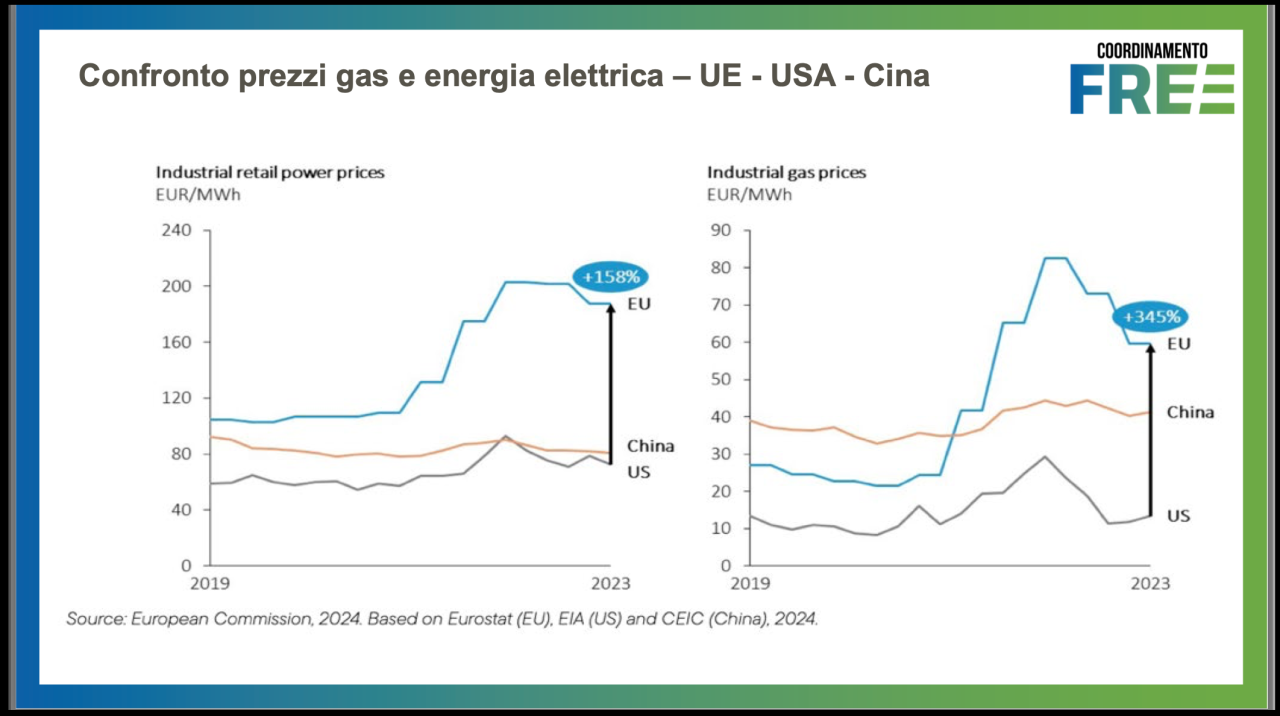 Secondo il Rapporto Draghi, nonostante la riduzione rispetto ai picchi del 2022, i prezzi dell’energia in Europa rimangono da tre a cinque volte superiori rispetto a quelli degli Stati Uniti. L'Europa deve accelerare la transizione verso fonti energetiche rinnovabili per diminuire la dipendenza dal gas naturale e favorire la stabilità dei prezzi. Tuttavia, il mercato energetico europeo è ancora legato alle fluttuazioni del gas, il cui prezzo stabilisce frequentemente il valore marginale, anche se rappresenta solo il 20% del mix elettrico.