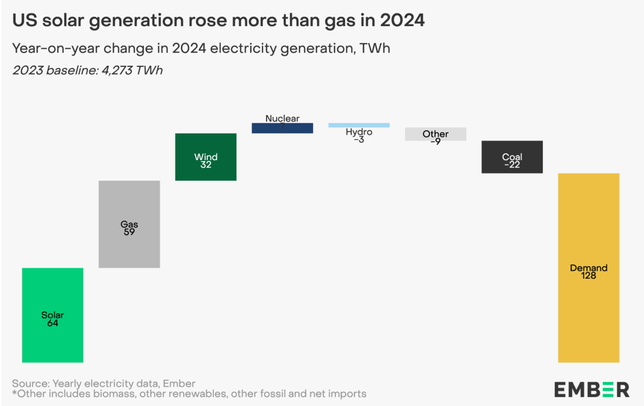 La prima cifra: 17%. Ovvero: l’eolico e il solare insieme hanno prodotto la cifra record del 17% dell’elettricità statunitense nel 2024, superando per la prima volta il carbone, assestato sul 15%. La seconda cifra è un’altra percentuale: 3%. E corrisponde all’aumento annuale della domanda di elettricità, il quinto più grande aumento annuale di questo secolo. La terza cifra: 64 TWh. Ovvero: l’aumento annuale della produzione solare, superiore all’aumento di 59 TWh della produzione di gas.
