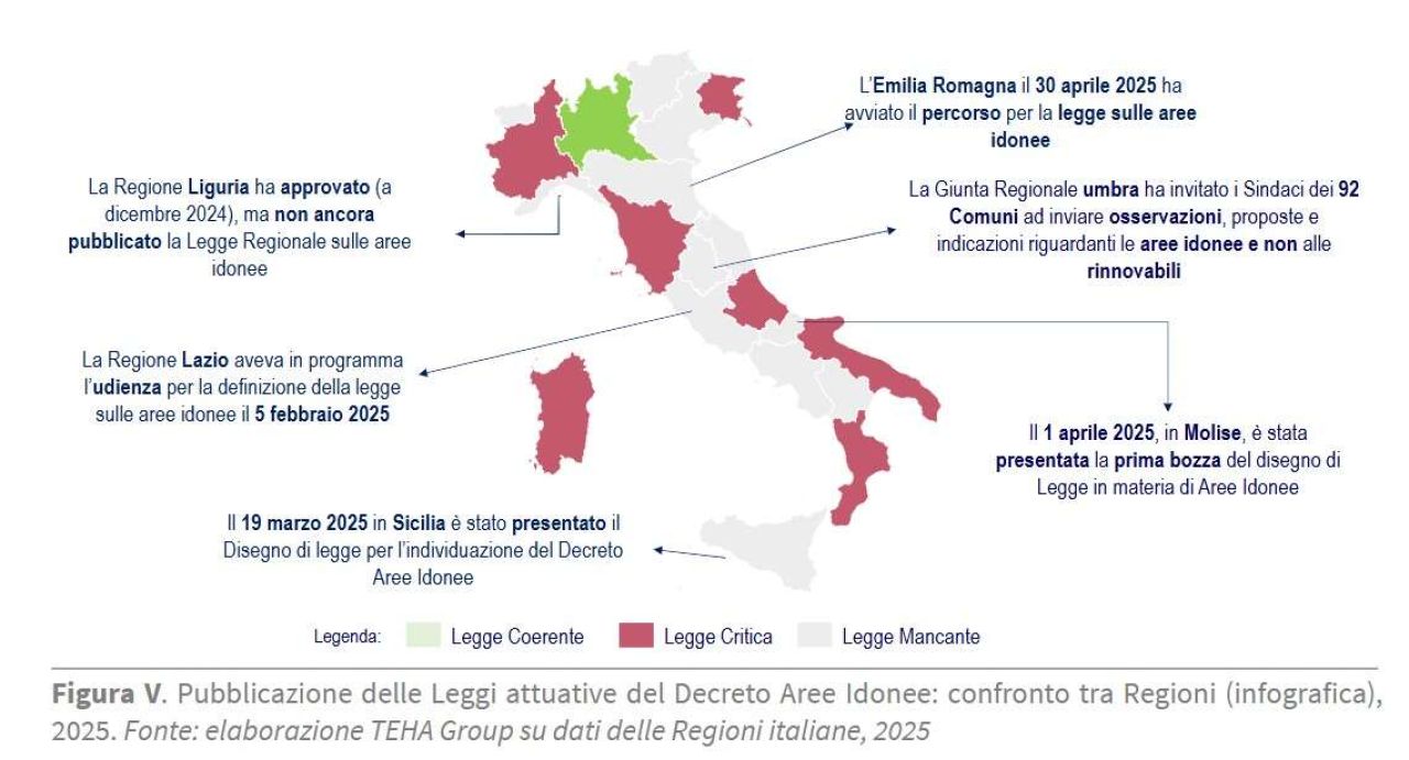 Il primo caso sottolinea le storture presenti nella governance multilivello che interessa il mondo dell’energia italiano. Tale frammentazione istituzionale si traduce in una ripartizione delle competenze tra Stato e regioni dove, in alcuni casi - come la produzione, il trasporto e la distribuzione dell’energia -, lo Stato detta i principi fondamentali mentre spetta alle regioni occuparsi degli aspetti applicativi. “In assenza di un coordinamento efficace, tale assetto ha generato disomogeneità nell’attuazione delle politiche energetiche, rallentando i processi decisionali e minando la coerenza nazionale”, si legge nel Rapporto “L’attuazione del Decreto aree idonee rappresenta un esempio emblematico di questa frammentazione. Nonostante la scadenza del dicembre 2024 per l’adozione delle relative Leggi regionali, a maggio 2025 più della metà delle Regioni risultava inadempiente. Inoltre, là dove le normative sono state definite, si riscontra spesso un disallineamento sostanziale rispetto alle linee guida nazionali, con criteri e vincoli che limitano fortemente la disponibilità di aree effettivamente idonee all’installazione di impianti Fer”.