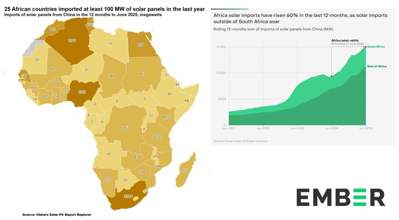 Anche se per l’Africa l'energia solare non è una novità e da più di 20 anni contribuisce a migliorare la vita, nelle scuole e negli ospedali rurali, fa risparmiare i consumatori e permette l'illuminazione stradale, il pompaggio dell'acqua e la realizzazione di mini-reti nelle aree rurali, attualmente, solo Sudafrica ed Egitto hanno una capacità solare installata misurata in gigawatt e non in megawatt. Ma il rapporto EMBER per l’Africa, che si basa sull’altro rapporto “Ember’s China Solar Export Explorer” realizzato grazie ai dati dell’Amministrazione Generale delle Dogane della Repubblica Popolare Cinese (GACC), mostra le prme evidenze di un vero e proprio decollo dell'energia solare in Africa: negli ultimi 12 mesi, le importazioni di pannelli solari dalla Cina sono aumentate del 60% raggiungendo i 15.032 MW. Negli ultimi due anni, le importazioni di pannelli solari al di fuori del Sudafrica sono quasi triplicate, passando da 3.734 MW a 11.248 MW. Questo aumento ha interessato tutta l'Africa. Nei 12 mesi fino a giugno, 20 Paesi hanno stabilito un nuovo record per le importazioni di pannelli solari. 25 Paesi hanno importato almeno 100 MW, in aumento rispetto ai 15 paesi di 12 mesi prima.