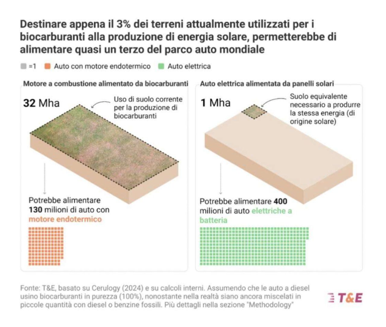 Un cortocircuito emerso grazie all’ultimo studio pubblicato nel merito dall’associazione ambientalista Transport&Environment (T&E), dal quale emerge che allocare così tanto suolo alla produzione di biocarburanti è uno spreco. Far sì che i terreni attualmente destinati alla coltura di biomasse tornino a essere ecosistemi naturali garantirebbe l’assorbimento di oltre 400 MtCO₂eq all'anno. Dall’altro, destinare appena il 3% di questa superficie per la produzione di energia solare genererebbe la stessa quantità di energia. Ma, poiché i veicoli elettrici sono molto più efficienti delle auto endotermiche, l’energia solare prodotta sfruttando quel 3% di suolo sarebbe poi sufficiente per alimentare quasi un terzo dell'attuale parco auto mondiale.