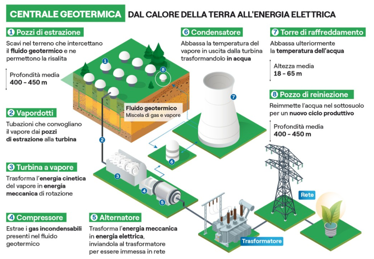 Nelle centrali a ciclo diretto il vapore secco viene estratto direttamente dal sottosuolo e trasportato alla centrale tramite vapordotti per poi essere convogliato verso una turbina, che lo trasforma in energia meccanica, successivamente convertita in energia elettrica da un generatore; invece nelle centrali flash (o a separazione) l’acqua ad alta pressione viene portata in superficie, dove subisce una decompressione che separa la parte liquida dal vapore, che poi aziona la turbina.
