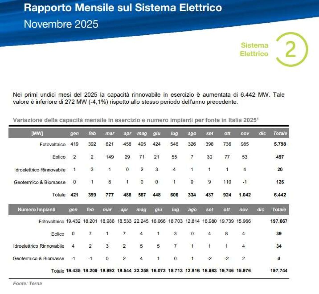 Nel mese di novembre 2025, la domanda di energia elettrica è stata soddisfatta per il 52,5% da fonti energetiche non rinnovabili, per il 31,9% da fonti energetiche rinnovabili (era il 33,9% a novembre 2024) e la restante quota dal saldo estero. Sempre a novembre, la produzione da rinnovabili risulta in calo (-4,2%) rispetto allo stesso mese del 2024: si registra un aumento della produzione eolica (+2,3%) e da fonte fotovoltaica (+13,6%) e una riduzione della produzione idroelettrica rinnovabile (-21,5%), quest’ultima variazione in parte conseguenza dell’elevata idraulicità registrata nel 2024.