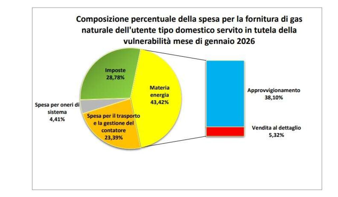 La componente del prezzo del gas a copertura dei costi di approvvigionamento (CMEM,m), applicata ai clienti nel servizio di tutela della vulnerabilità, viene aggiornata da Arera come media mensile del prezzo sul mercato all’ingrosso italiano (il Psv day ahead, dove il costo del gas è peraltro più alto di circa il 25% rispetto al riferimento europeo Ttf). «Le condizioni meteo particolarmente rigide, che hanno contraddistinto il primo mese del 2026, hanno spinto verso l’alto la domanda di gas, con inevitabili ripercussioni sul costo finale degli approvvigionamenti», spiega Arera. Un fattore che potrebbe essere progressivamente superato passando dall’impiego di combustibili fossili, come il gas, alle fonti rinnovabili.