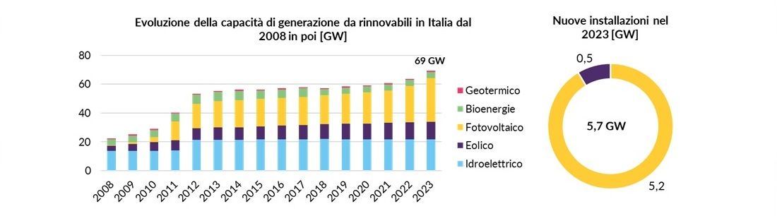 Nel 2023 sono entrati in esercizio +5,7 GW di nuovi impianti, rispetto ai +9 GW previsti dal Piano nazionale integrato energia e clima (Pniec) – che l’Ue chiede peraltro da aggiornare entro fine giugno, perché poco ambizioso – e i +12 GW indicati dall’associazione confindustriale Elettricità futura.