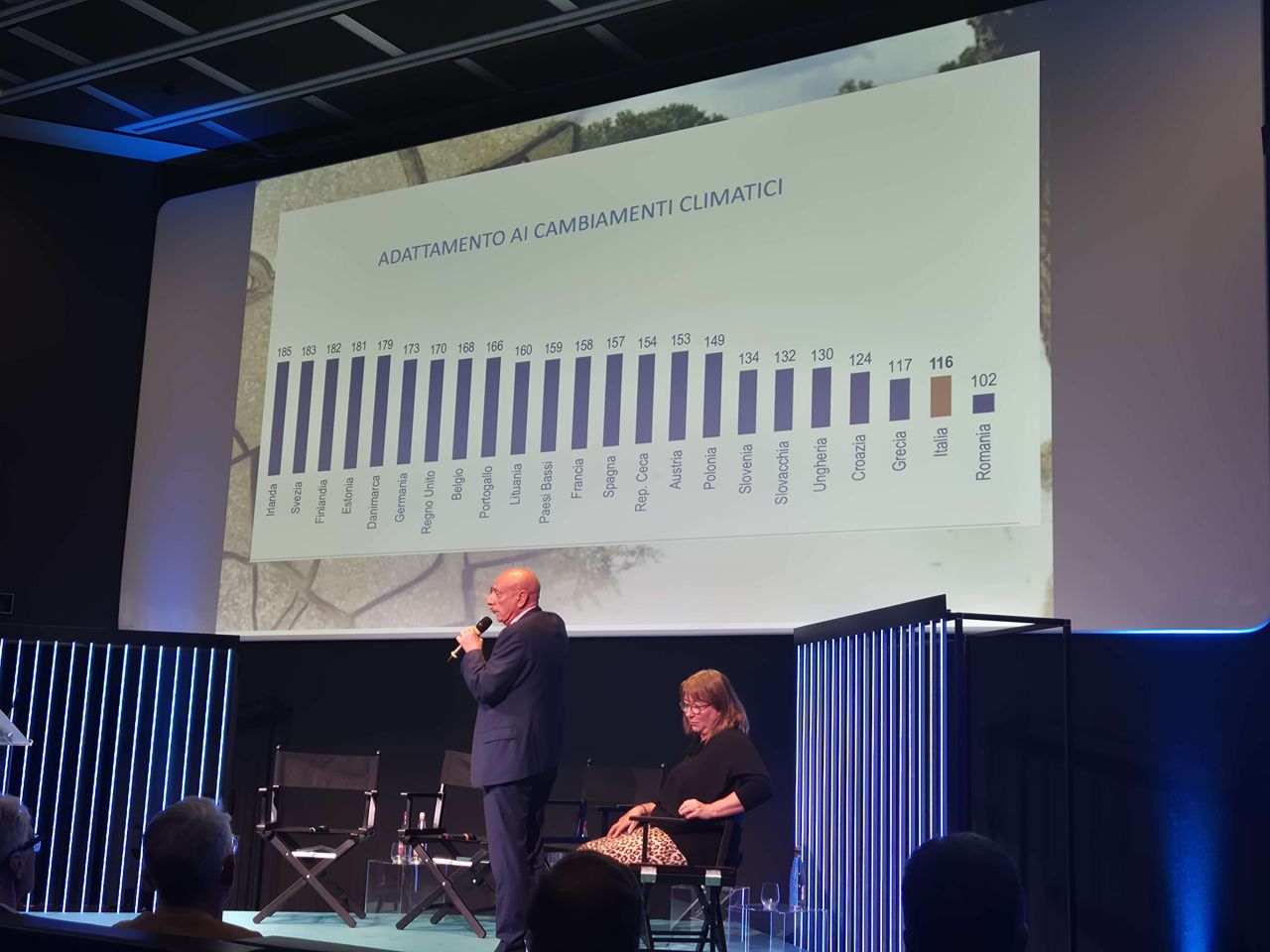 Erasmo D’Angelis, aprendo ieri la sessione dal titolo “Dalla città indifesa alla città spugna”, ha mostrato il grafico da cui deve partire ogni ragionamento: per investimenti e politiche di adattamento ai cambiamenti climatici l’Italia è in fondo alla classifica dei Paesi europei, nonostante la nostra penisola sia storicamente, geologicamente e geograficamente più esposta di tante altre regioni del continente a eventi meteo estremi e calamità naturali: basti pensare che sono italiane due terzi di tutte le frane censite in Europa, per non parlare delle zone a rischio alluvione e, altro capitolo toccato nel corso della discussione, a rischio sismico (il commissario straordinario del governo per la ricostruzione del sisma 2016, Guido Castelli, ha lanciato un alert sull’intersecarsi di crisi climatica, sismica e demografica in corso nel Centro Italia e nei centri dell’Appennino, perché «un territorio abbandonato è più fragile e dunque più a rischio per gli effetti dei cambiamenti del clima»). Bisogna correggere la rotta, ha detto D’Angelis, perché oggi spendiamo molto di più per intervenire nelle emergenze da troppa o poca acqua che non in opere di prevenzione: 600 milioni di investimento pubblico per queste ultime contro i circa 6 miliardi annui solo per riparare i danni prodotti dalle alluvioni. Di fronte al cambiamento climatico, ha sottolineato, è ancora più evidente che serve un cambio delle priorità che metta al primo posto la prevenzione, perché i soldi dirottati in questo settore «non sono una spesa ma un investimento». E serve un cambiamento urbano, fatto di interventi, tecnologie, progetti che l’Italia sta esportando e realizzando in tutto il mondo e che andrebbero però prima di tutto attuati nel nostro paese.