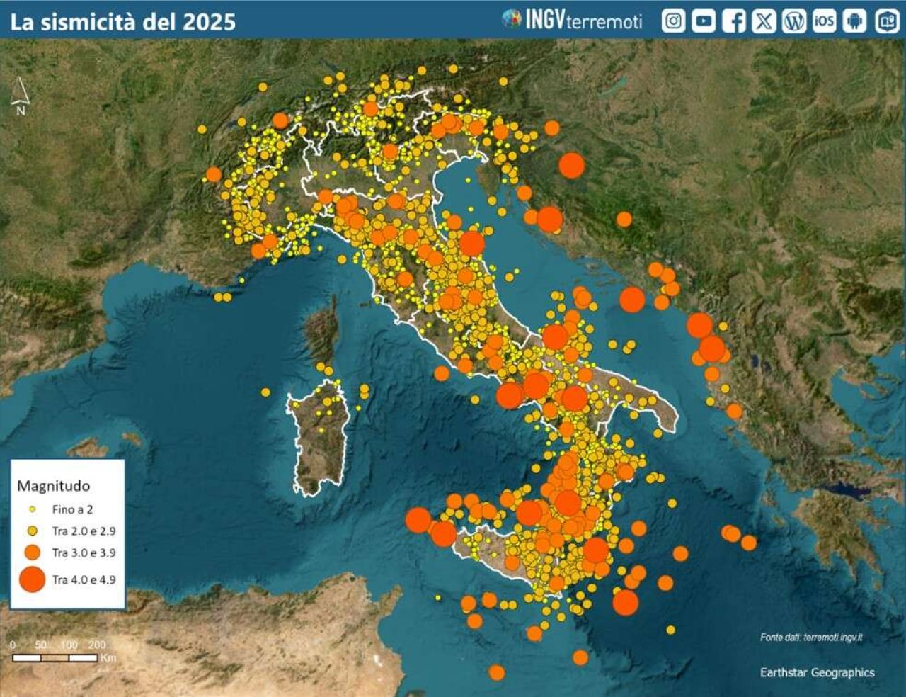 Nel corso dell’anno, poco più del 10% degli eventi sismici ha avuto magnitudo pari o superiore a 2. Il più forte terremoto del 2025, di magnitudo Mw 4.8, è stato localizzato il 14 marzo al largo della costa della provincia di Foggia; da segnalare inoltre che è proseguita l’attività sismica nell’area dei Campi Flegrei, dove il 13 marzo e il 30 giugno sono stati localizzati i due terremoti con le più elevate magnitudo della crisi bradisismica in atto (Md 4.6).