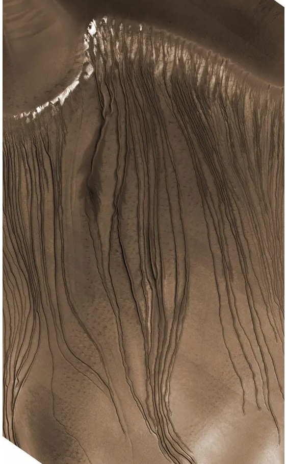 Fenomeni osservati sulla duna marziana Russel associati alla possibilità di brinamento d’acqua (Elaborato su immagine HiRISE/MRO: ESP_064682_1255 NASA/JPL-Caltech/UArizona)