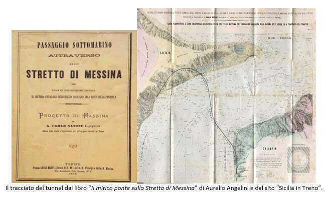 Il primo progetto di tunnel sottomarino lo presentò nel 1870, ai tempi del re Vittorio Emanuele II di Savoia e del Presidente del Consiglio Giovanni Lanza, il giovane e brillante ingegnere piemontese Alberto Carlo Navone definendolo: “Passaggio sottomarino attraverso lo Stretto di Messina per unire in comunicazione continua il sistema stradale e ferroviario siciliano alla rete della penisola”. Prevedeva la costruzione di un tunnel tra Villa San Giovanni e Ganzirri della lunghezza di circa 4 km, a 33 metri sotto il livello del fondo marino e ad una profondità di circa 170 metri dal pelo d’acqua. Il tracciato completo avrebbe avuto una lunghezza totale di 8,5 km con l’aggiunta dell’attraversamento sotterraneo anche delle due città di arrivo: Reggio e Messina. Il suo “tubone” conteneva 2 tronchi ferroviari che avrebbero permesso ai treni di scendere sotto il mare e poi risalire sfruttando la forza di gravità accumulata nella discesa. Il progetto in quel tempo di innovazioni ingegneristiche aprì un interessante dibattito tecnico. È “un miracolo a portata di mano”, prometteva l’ideatore. Ma il costo era assai proibitivo, un botto da 37.620.000 lire, all’incirca una cinquantina di miliardi di oggi, per 4 anni di cantieri. Il progetto fu quindi cestinato, ma l’ingegnere si rifece progettando i tracciati delle linee ferroviarie Lucana, Circumetnea, della direttissima Milano-Genova, e ponti e gallerie.