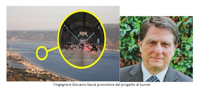 L'uomo del tunnel del giorno 4 luglio 2020 è il messinese Giovanni Saccà, 68enne ingegnere pensionato delle Ferrovie dello Stato, esperto del ramo elettrotecnica e sistemi di segnalamento e Presidente della Commissione Infrastrutture dell’Ordine degli ingegneri della Lombardia. Il suo tunnel lo aveva descritto sul sito siciliaintreno.org il 20 Novembre 2019 come “…una galleria ferroviaria a doppia canna lunga circa 36 km percorribile ad una velocità massima di 200 km/h che potrebbe, oltre che attraversare lo stretto di Messina in modo stabile e sicuro, collegare direttamente e velocemente la città di Messina con quella di Reggio Calabria in modo da favorire lo sviluppo e l’integrazione delle due città in una grande Città Metropolitana, che per popolazione diverrebbe la 7° città d’Italia e la 3° del sud Italia”. Aveva poi presentato l’ipotesi di attraversamento in subalveo dello Stretto sia stradale che ferroviario in alcuni convegni tecnici. Aveva rispolverato, spulciando tra gli atti parlamentari, il “Doc. XXVII N. 3” della decima legislatura della Camera con la relazione presentata dall’allora Ministro dei Trasporti Giorgio Santuz - Governo De Mita dal 13 aprile 1988 al 21 luglio 1989 - studi commissionati dalla Spa Stretto di Messina “…relativi a una soluzione di attraversamento stabile dello Stretto di Messina tramite gallerie alvee: una galleria di diametro 27,50 metri immersa in acqua a -40 metri ed ancorata a fondali di 110 metri, sulla direttrice a nord di Punta Pezzo-Ganzirri; una galleria di diametro 27,50 metri immersa in acqua a -40 metri ed ancorata a fondali di 300 metri sulla direttrice Concessa-Falcata. I primi due livelli destinati a tre corsie stradali per ogni direzione più emergenza ed il terzo livello destinato a due binari delle ferrovie dello Stato più due passaggi di emergenza, al costo tecnico presumibile di 6.800-7.100 miliardi di lire (pari a 3.511.906.913,81€ - 3.666.843.983,54€), compresi gli accessi viari di 22 chilometri (di cui 20 in galleria) e ferroviari di 31 chilometri in galleria ed eseguibili in 11 anni”.