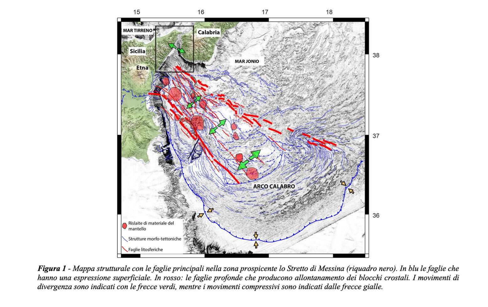 Il punto è che nei fondali dello Stretto, come emerge dalla mappa CNR, convergono sistemi di faglie profonde che nella storia da sempre hanno innescato grandi terremoti, ampie frane sottomarine, deformazioni gravitative profonde di versante. Lo Stretto, scrive Chiarelli, è “una zona di svincolo, una sorta di perno che assorbe i movimenti di diverse strutture geologiche, tra le più attive e pericolose di tutto il Mediterraneo. Sulla sponda tirrenica la litosfera africana si immerge in profondità e arretrando verso sud-est trascina con sé parte della Calabria e della Sicilia Nord-Orientale. Dall’altro lato, nello Ionio, sono presenti estesi sistemi di faglie che accomodando la convergenza tra le placche africana ed eurasiatica. Una fascia di deformazione ampia che coinvolge direttamente lo Stretto collega questi due sistemi di strutture tettoniche provocando lo sprofondamento dello Ionio occidentale, proprio di fronte allo Stretto. Queste ultime strutture sono profonde, lunghe decine di chilometri e molto attive, come dimostrato da fenomeni particolari come la risalita di fluidi profondi e processi vulcanici. L’Etna, il più grande e attivo vulcano europeo, si è formato proprio su una di queste strutture”.