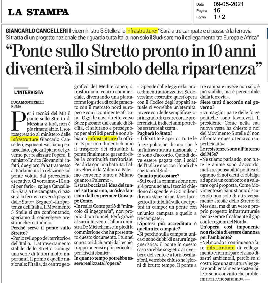 La giravolta da carpiato con triplo avvitamento del Movimento 5 Stelle spiazza tutti e l’11 maggio 2021 i parlamentari grillini si ritrovano in assemblea congiunta sulla questione Ponte sullo Stretto, alla presenza del Cancelleri viceministro che, il 9 maggio intervistato su La Stampa da Luca Monticelli, stravedeva e prevedeva persino che il “Ponte sullo Stretto pronto in 10 anni, diventerà il simbolo della ripartenza…Sarà a tre campate e ci passerà la ferrovia. Si tratta di un progetto che riguarda tutta Italia, non solo il Sud: saremo il collegamento tra Europa e Africa…Serve una legge ad hoc come a Genova, il costo potrebbe essere 5 miliardi…La domanda che dobbiamo porci non è più se siamo favorevoli o meno al Ponte” bensì “se siamo d’accordo che l’alta velocità da Salerno arrivi fino a Palermo“. Ma anche sul tunnel sottomarino assicura che “i modelli che abbiamo studiato nel mondo usano tecnologie capaci di reggere a scosse di 7,5 gradi della scala Richter…“. Costo? “Tra i 4,8 e i 5 miliardi. Abbiamo i soldi del Recovery fund e il piano di rilancio va presentato a ottobre. E’ un’occasione irripetibile“.