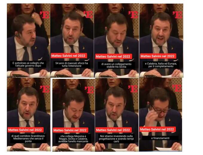 Salvini diventò lo sponsor numero uno del ponte, passando così con nonchalance da quel “non sta in piedi…" del 2016, poi all’”opera interamente finanziata da privati, fondamentale per unire Italia ed Europa e quando prendo un impegno lo porto fino in fondo e il Ponte sarà realtà” del 2022, quindi all’annuncio di un decreto urgente per far applicare all’opera il modello di ricostruzione in emergenza del Ponte Morandi di Genova con autorizzazioni iper-veloci per “vedere se dopo 54 anni di ritardi, chiacchiere e mancate promesse riusciamo ad avviare il progetto e creare subito almeno 100mila posti di lavoro”, e alla promessa che “Nel 2032 il Ponte sarà transitabile. Le risorse ci sono…la legge di bilancio copre l’intero fabbisogno”. E promettendo al mondo intero che quando nascerà, sarebbe stato battezzato: “Ponte Silvio Berlusconi”.