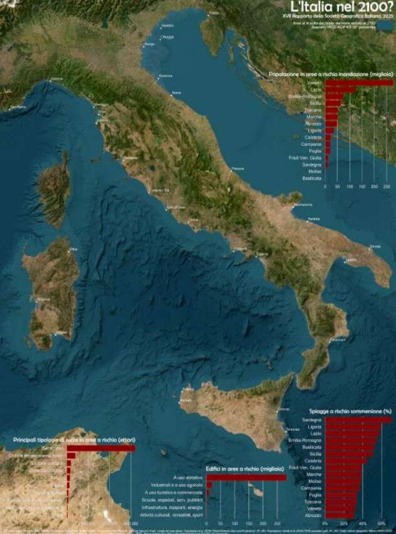 Eppure, il bisogno di un intervento integrato si fa sempre più impellente sostengono i “Geografi”. Gli scenari previsionali rendono evidente la portata delle trasformazioni in atto. Nell’Alto Adriatico, ad esempio, l’innalzamento del livello del mare e la subsidenza espongono vaste aree alla sommersione permanente entro fine secolo, con conseguenze rilevanti per città come Venezia, Chioggia o Ravenna. In altre regioni, come Sardegna, Lazio, Toscana o Puglia, le piane costiere sono sempre più esposte a inondazioni e intrusioni saline, che mettono a rischio produzioni agricole, infrastrutture e risorse idriche. Le spiagge sabbiose, già oggi fortemente erose, potrebbero ridursi fino a quasi la metà, compromettendo un modello turistico intensivo che per decenni ha costituito una delle principali fonti di reddito locale.