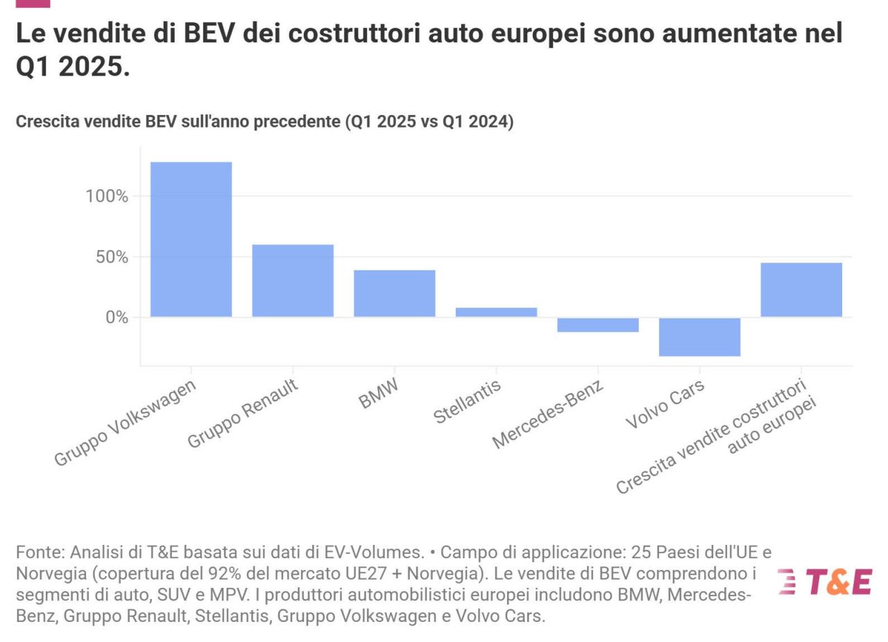 Nei primi tre mesi del 2025, evidenzia infatti T&E facendo appello ai dati, le vendite di veicoli elettrici a batteria sono aumentate del 45% rispetto allo stesso periodo dell'anno precedente. Un fatto che mal si concilia con la decisione della Commissione europea presa ad aprile, che ha risposto alle pressioni dei produttori auto concedendo loro due anni in più - fino al 2027 - per rispettare gli obiettivi di riduzione delle emissioni previsti per il 2025.
