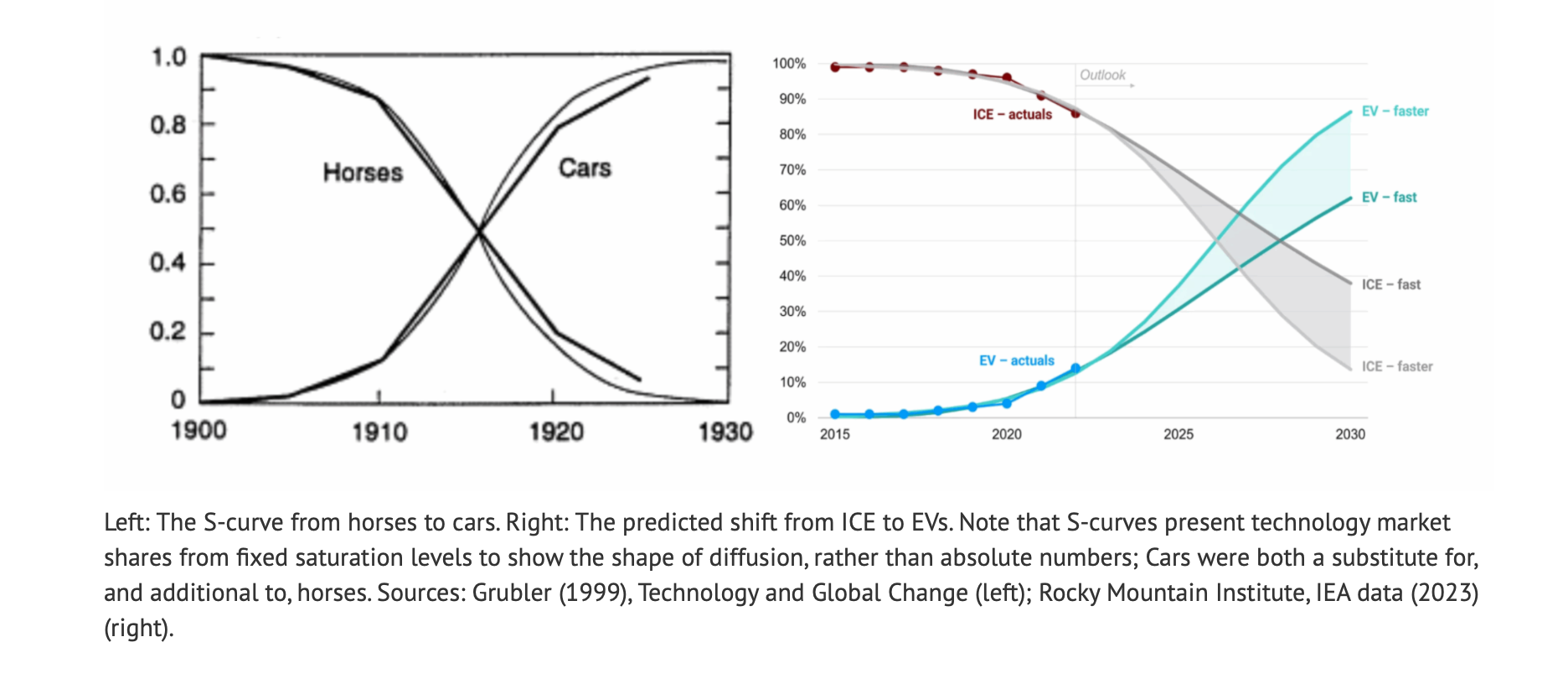 Ed ecco allora che entrano in scena i cavalli. I veicoli elettrici stanno ormai superando la fase di adozione iniziale e stanno iniziando a diffondersi su larga scala. Secondo l’Agenzia internazionale per l’energia, oggi ne circolano quasi 60 milioni: erano soltanto 1,2 milioni appena dieci anni fa. «Cambiamenti tecnologici di questa portata possono verificarsi più rapidamente del previsto – scrivono gli analisti di Carbon brief – all’inizio del secolo scorso negli Stati Uniti, ad esempio, milioni di cavalli e muli sono praticamente scomparsi dalle strade in meno di trent’anni». All’esempio seguono due grafici messi in parallelo: uno illustra il passaggio negli anni dal cavallo alle auto, l’altro il passaggio dai veicoli con motori a combustione interna a quelli elettrici. Le due curve a S sono identiche fino al momento attuale. E, salvo sconvolgimenti a livello mondiale difficili da immaginare, la curva delle auto a batteria continuerà a puntare verso l’alto e quella dei motori a benzina e gas a puntare verso il basso. Si legge tra l’altro nell’analisi di Carbon brief: «I veicoli con motore a combustione interna non sono diventati il mezzo di trasporto dominante solo grazie alla loro superiorità tecnica. Sono stati sostenuti da massicci investimenti pubblici in strade, pianificazione urbana, zonizzazione ed espansione delle autostrade, finanziati dalle tasse sul carburante. Nel frattempo, hanno subito poche sanzioni per l’inquinamento e le esternalità, beneficiando di sussidi impliciti rispetto alle alternative più pulite. La standardizzazione, la politica industriale e gli appalti in tempo di guerra hanno ulteriormente consolidato quei motori. I veicoli elettrici sono in una posizione favorevole per seguire una traiettoria più rapida, poiché sostituiscono direttamente i veicoli a combustione interna pur essendo più puliti, economici e silenziosi. Le transizioni passate dimostrano che le sostituzioni alla pari, come il passaggio dalla Tv in bianco e nero a quella a colori, tendono a diffondersi più rapidamente rispetto ai prodotti completamente nuovi. Anche chi adotta tardi queste tecnologie beneficia della riduzione dei costi e delle norme consolidate. Ad esempio, ci sono voluti 60 anni perché la proprietà delle automobili si diffondesse negli Stati Uniti, ma solo 20 anni in alcune parti dell’America Latina e del Giappone».
