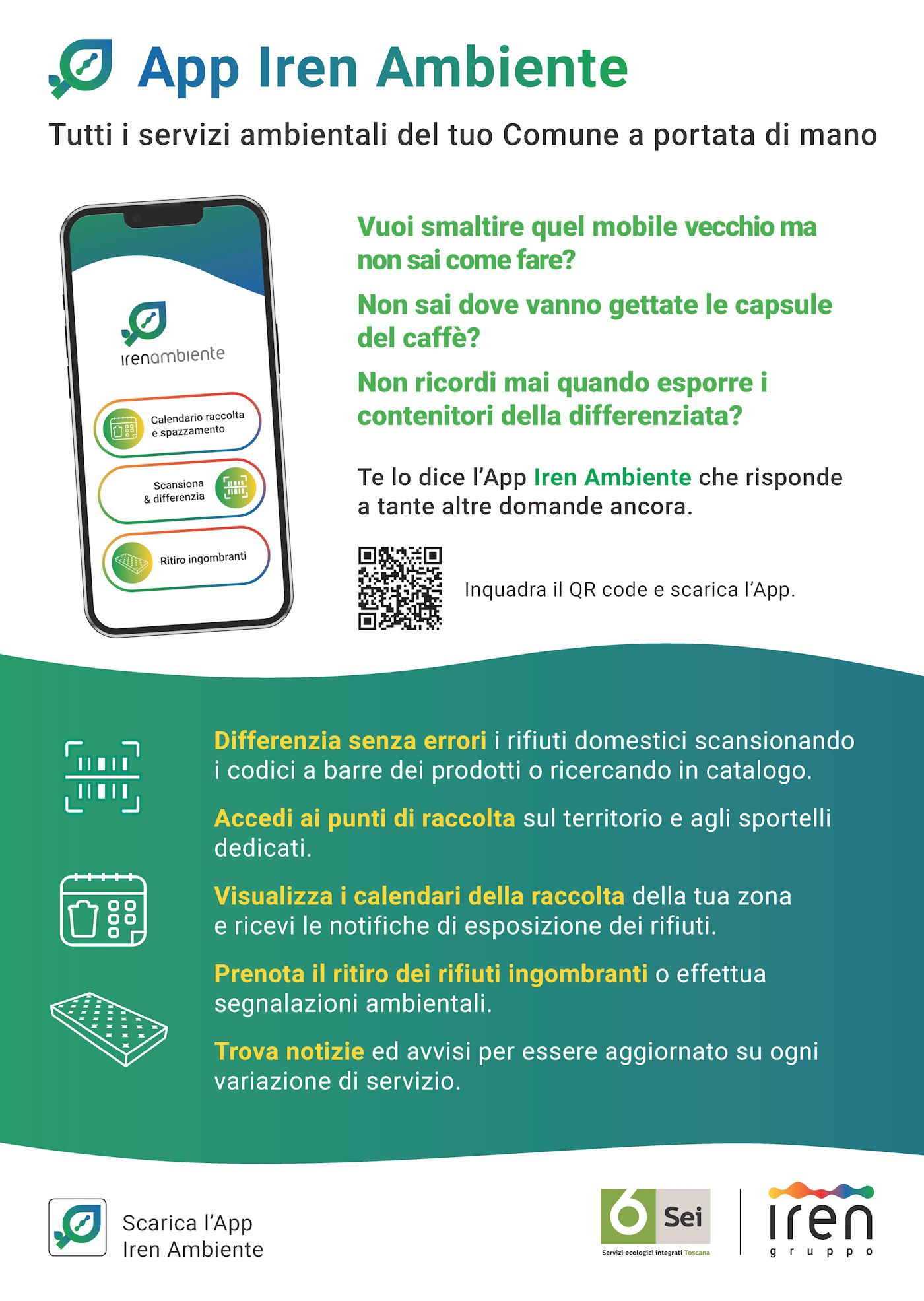 «Possiamo proprio dire che l’ambiente è sempre più a portata di mano – dichiara il presidente di Sei Toscana, Alessandro Fabbrini – L’ingresso di Sei Toscana nel mondo del gruppo Iren porta un ulteriore beneficio alle nostre comunità, mettendo a disposizione di tutti, in modo gratuito, uno strumento utile per gestire correttamente i propri rifiuti. La nuova app prende il posto di quella utilizzata da Sei Toscana in questi anni, portando alcune migliorie e offrendo diverse funzionalità per il cittadino».