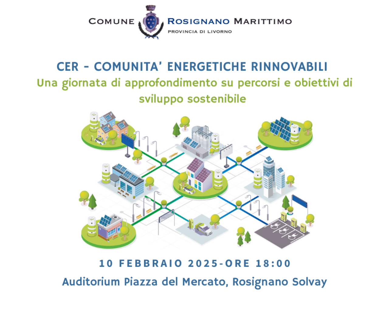 Il 10 febbraio, alle ore 18:00 presso l'Auditorium di piazza del Mercato, a Rosignano Solvay si terrà un incontro pubblico per presentare le prospettive e le opportunità offerte dalla Cer per il consumo e la gestione condivisa di energia elettrica da fonti rinnovabili. Oltre al vicesindaco Mario Settino, saranno presenti i tecnici della Provincia di Livorno e di Enerdgy4Com, società incaricata del piano di fattibilità e della costituzione della comunità energetica, per rispondere alle domande dei cittadini e facilitare la compilazione della modulistica.