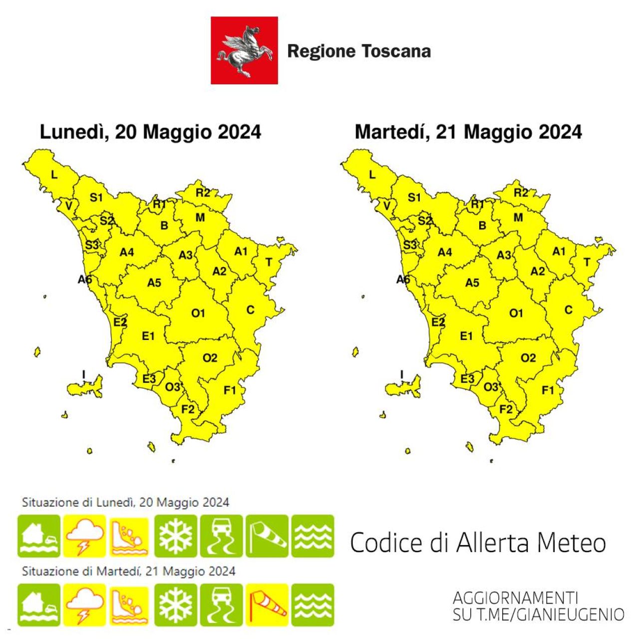 L’allerta è per pioggia e temporali forti (rischio idrogeologico e idraulico del reticolo minore), valida dalle 14 di lunedì 20 alle 9 di martedì 21 maggio; a questa si aggiunge un’allerta meteo per vento, valida dalle 12 alle 22 di martedì 21.