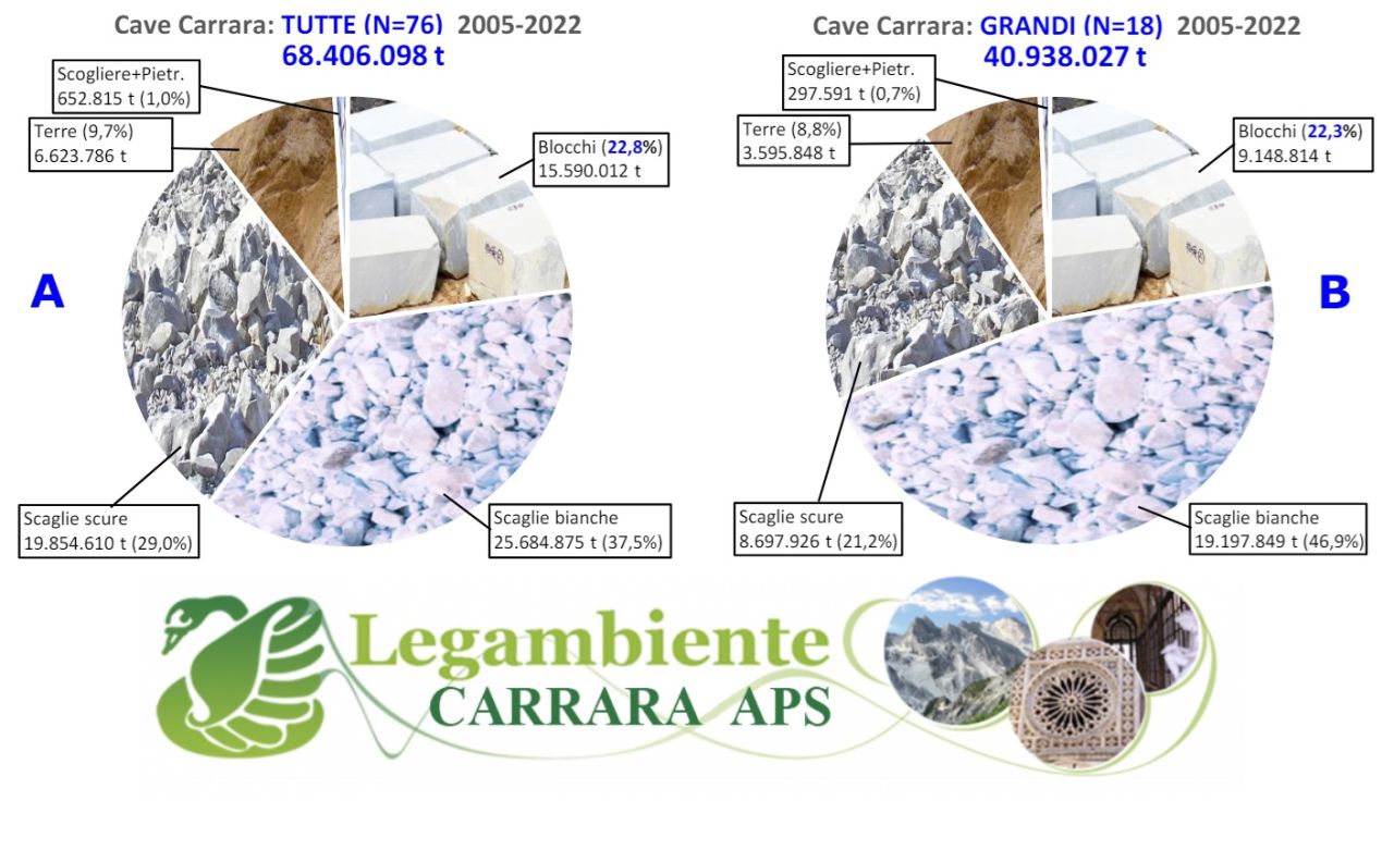 I dati raccolti grazie alla precedente richiesta del circolo di Legambiente Carrara confermano le preoccupazioni espresse da tempo dall’associazione sull’effettiva sostenibilità ambientale, sociale ed economica, del comparto: «Nelle 76 cave attive analizzate da Legambiente, è stato estratto tra il 2005 e il 2022 un totale di oltre 68 milioni di tonnellate di materiali (68.406.908), di cui soltanto il 22,8% è composto da blocchi di marmo e ben il 77,2% da detriti (utilizzati perlopiù nell’industria del carbonato di calcio). Sono addirittura una decina le cave con una resa in blocchi inferiore al 10%. Numeri che sollevano dubbi sulle autorizzazioni concesse sulla base del vigente Piano di Indirizzo Territoriale con valenza di Piano Paesaggistico Regionale (PIT-PPR), che avrebbe dovuto garantire una pianificazione delle attività estrattive orientata allo sfruttamento razionale della risorsa marmo, nell’interesse della comunità. Sorvegliata speciale una della cave più grandi che dovrebbe, per Legambiente, essere dismessa: da questa, in 18 anni, sono state estratte oltre 4 milioni di tonnellate di materiali (4.243.570), di cui appena l’8,58% sono blocchi di marmo e oltre il 91% detriti».