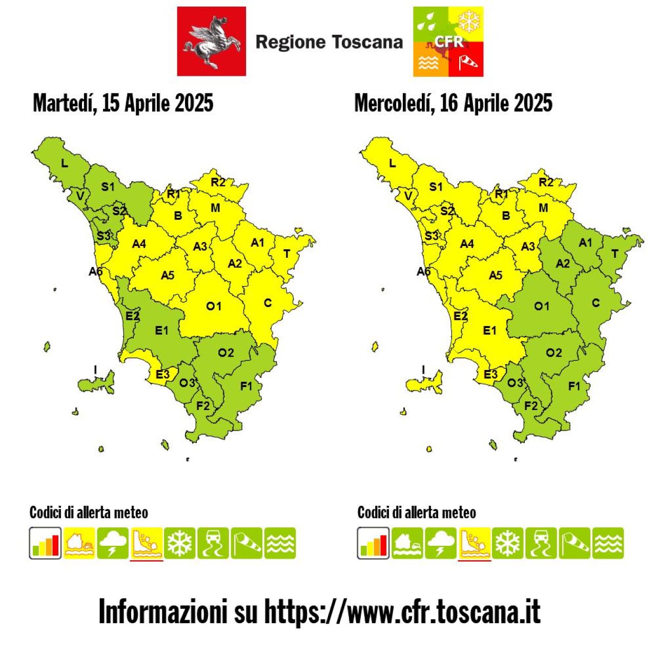 Nella giornata di domani, mercoledì 16 aprile, il codice giallo, dalle ore 11 fino alla mezzanotte, sarà solo per rischio idrogeologico e idraulico del reticolo minore e interesserà la Toscana nord, quella centro-occidentale, l’arcipelago e le aree costiere ad eccezione dell’estremo sud.