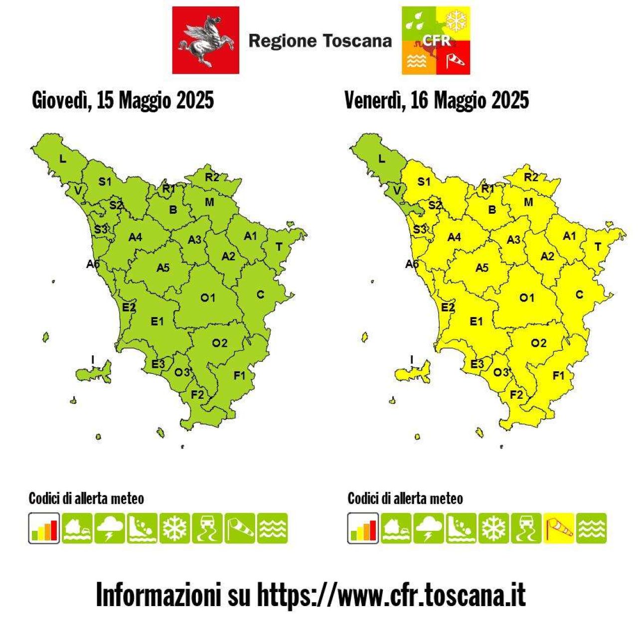Si tratta di un bollettino di criticità con codice giallo per venti forti che interesserà dalla mezzanotte fino alle ore 13 di domani, venerdì 16 maggio, tutto il territorio regionale ad esclusione di Versilia e Lunigiana. Si prevedono raffiche fino a 50-60 km/h in pianura e fino a 60-80 km/h in collina.