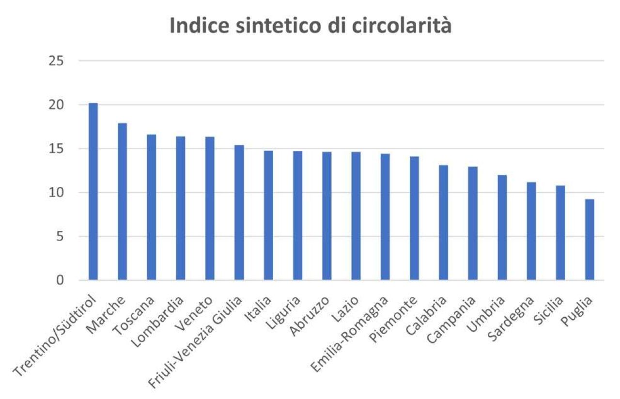 Le regioni prime in più indicatori sono il Trentino Alto Adige e il Lazio. Il Trentino Alto Adige in 8 indicatori: consumi finali di energia fossile per unità di Pil; percentuale totale rinnovabile sui consumi finali; percentuale totale rinnovabili sulla produzione elettrica; tasso di motorizzazione elettrica, kWh di risparmio energetico procapite conseguito con ecobonus e superbonus, rifiuti residui urbani per spesa delle famiglie, soddisfazione della popolazione per il paesaggio e per la situazione ambientale. Il Lazio invece in 6 indicatori: consumo di materia per unità di Pil, consumi finali di energia per unità di Pil, emissioni climalteranti per unità di Pil, produzione totale di rifiuti per unità di Pil, suolo consumato procapite e per unità di Pil.