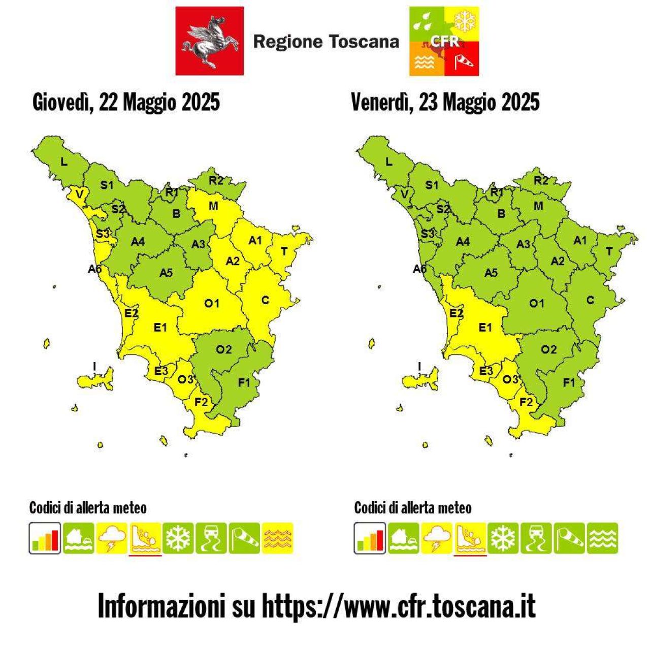 La Sala operativa unificata della Protezione civile toscana (Soup) ha diramato una nuova allerta meteo – dopo quella di ieri – che arriva a toccare la giornata di venerdì 23 maggio: si tratta di un codice giallo per rischio idrogeologico e temporali forti fino alle ore 8 di domani.