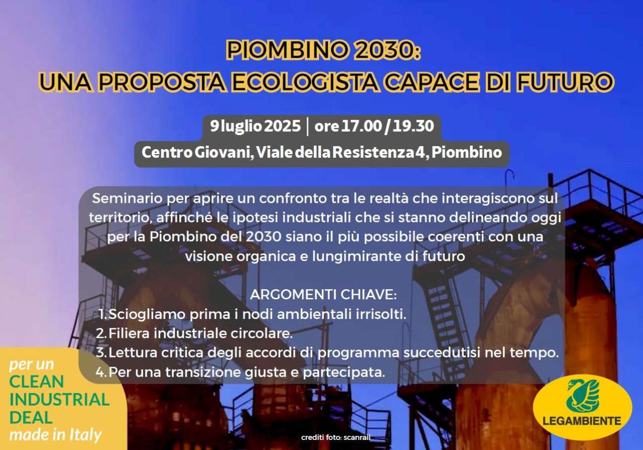 Piombino 2030: una proposta ecologista capace di futuro è il titolo del seminario pubblico organizzato da Legambiente per mercoledì 9 luglio, presso il Centro Giovani di Piombino (viale della Resistenza 4), dalle 17 alle 19.30. L’appuntamento intende offrire uno spazio di confronto trasparente e costruttivo tra cittadini, associazioni, sindacati e istituzioni, affinché le scelte industriali che si stanno delineando oggi per il rilancio dell’area siano coerenti con una visione lungimirante di sostenibilità ambientale, giustizia sociale e sviluppo territoriale.