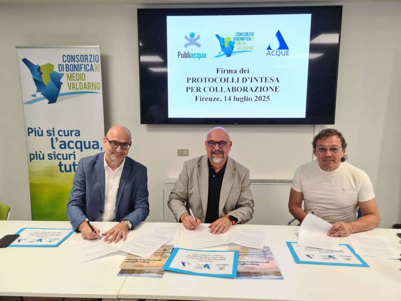 Stamani sono stati siglati due protocolli d’intesa tra Consorzio di Bonifica 3 Medio Valdarno, cui la Regione Toscana ha affidato la manutenzione ordinaria di un reticolo idrografico lungo 5.600 km, dall’Arno ai torrenti di montagna, passando per i canali artificiali di bonifica; Publiacqua, la partecipata pubblica che gestisce il servizio idrico integrato nei 46 Comuni che compongono l’Ato Medio Valdarno; Acque, che fornisce il medesimo servizio ma lungo il Basso Valdarno.