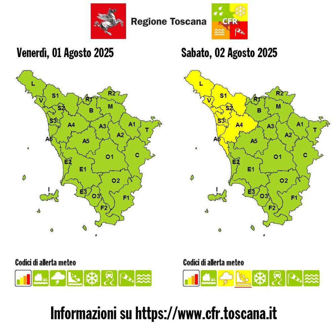 La Sala operativa unificata della Protezione civile toscana (Soup) ha diramato una nuova allerta meteo, di codice giallo, per rischio idrogeologico e temporali forti dalle ore 6 fino alle ore 18 di domani sabato 2 agosto sulla Toscana nord-ovest.
