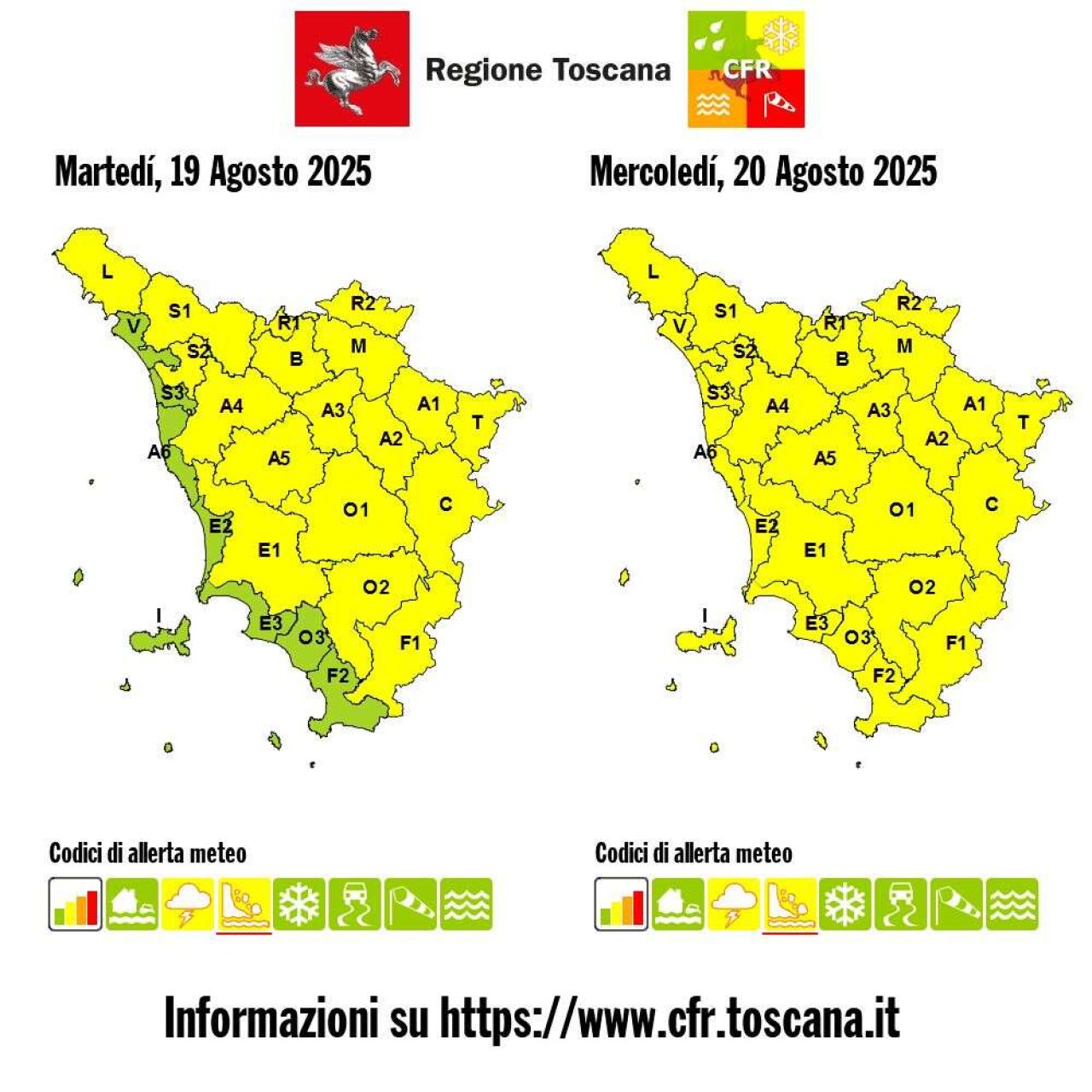 Allerta meteo, domani mercoledì 20 agosto tutta la Regione Toscana in codice giallo