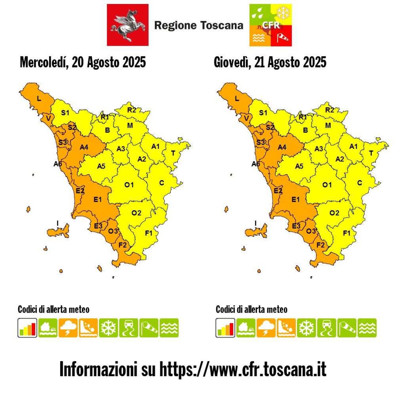 La Sala operativa unificata della Protezione civile toscana (Soup) ha diramato una nuova allerta meteo, con codice arancione per rischio idrogeologico e temporali forti dalle ore 18 di oggi fino alle ore 2 di domani giovedì 21 agosto su costa e Arcipelago, mentre l’allerta gialla (già in corso) resterà sul resto della regione fino alle ore 8 di domani.