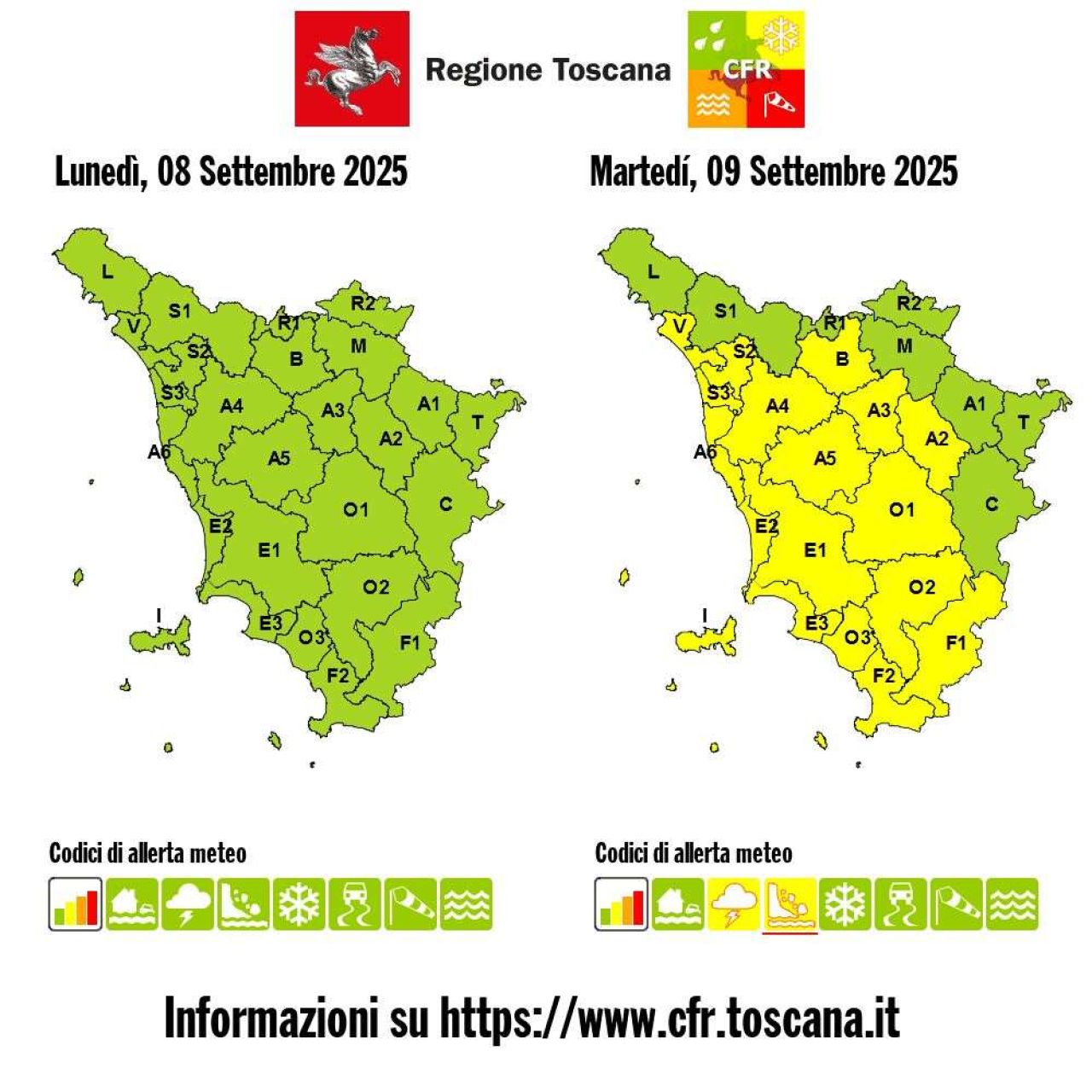 La Sala operativa unificata della Protezione civile toscana (Soup) ha appena diramato una nuova allerta meteo: si tratta di un codice giallo per rischio idrogeologico e temporali forti, dalle ore 7 e per il resto della giornata di domani martedì 9 settembre.