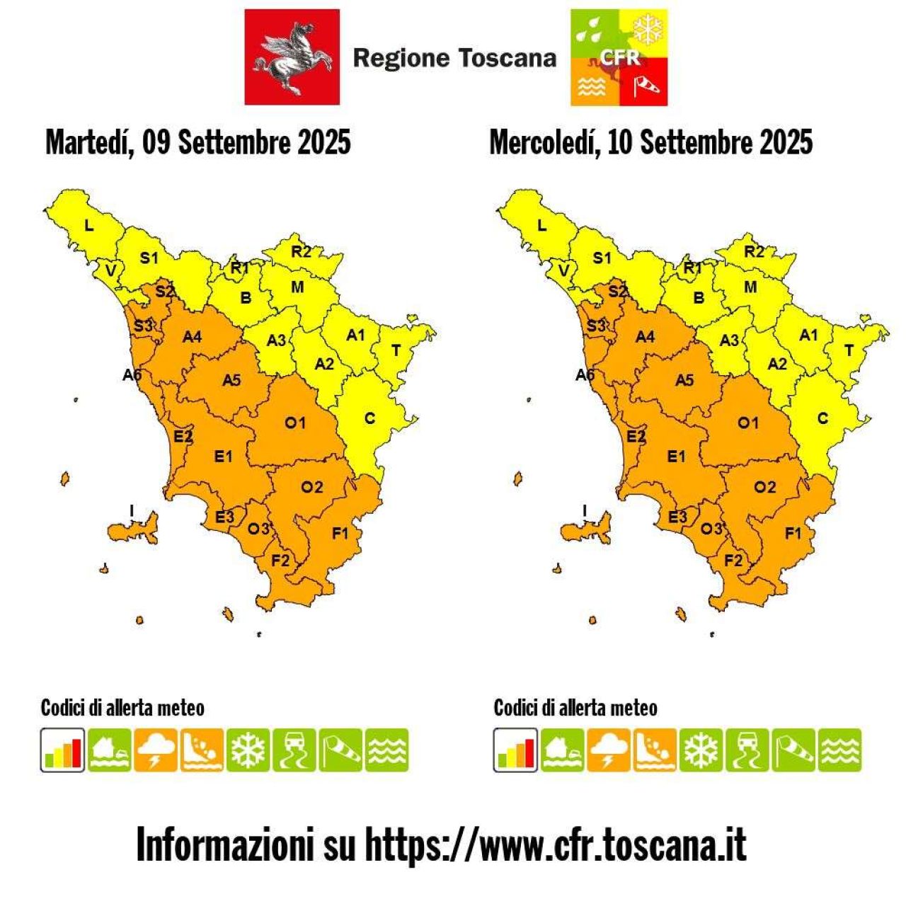 Nello specifico: il codice arancione per temporali anche forti e rischio idrogeologico parte dalle ore 17 di oggi, martedì 9 settembre e permane per la giornata di domani, mercoledì, fino alle ore 13 sulle zone costiere e occidentali (province di Lucca, Pisa, Livorno, Grosseto e parti ovest delle province di Firenze e Siena). Saranno possibili anche grandinate e colpi di vento.