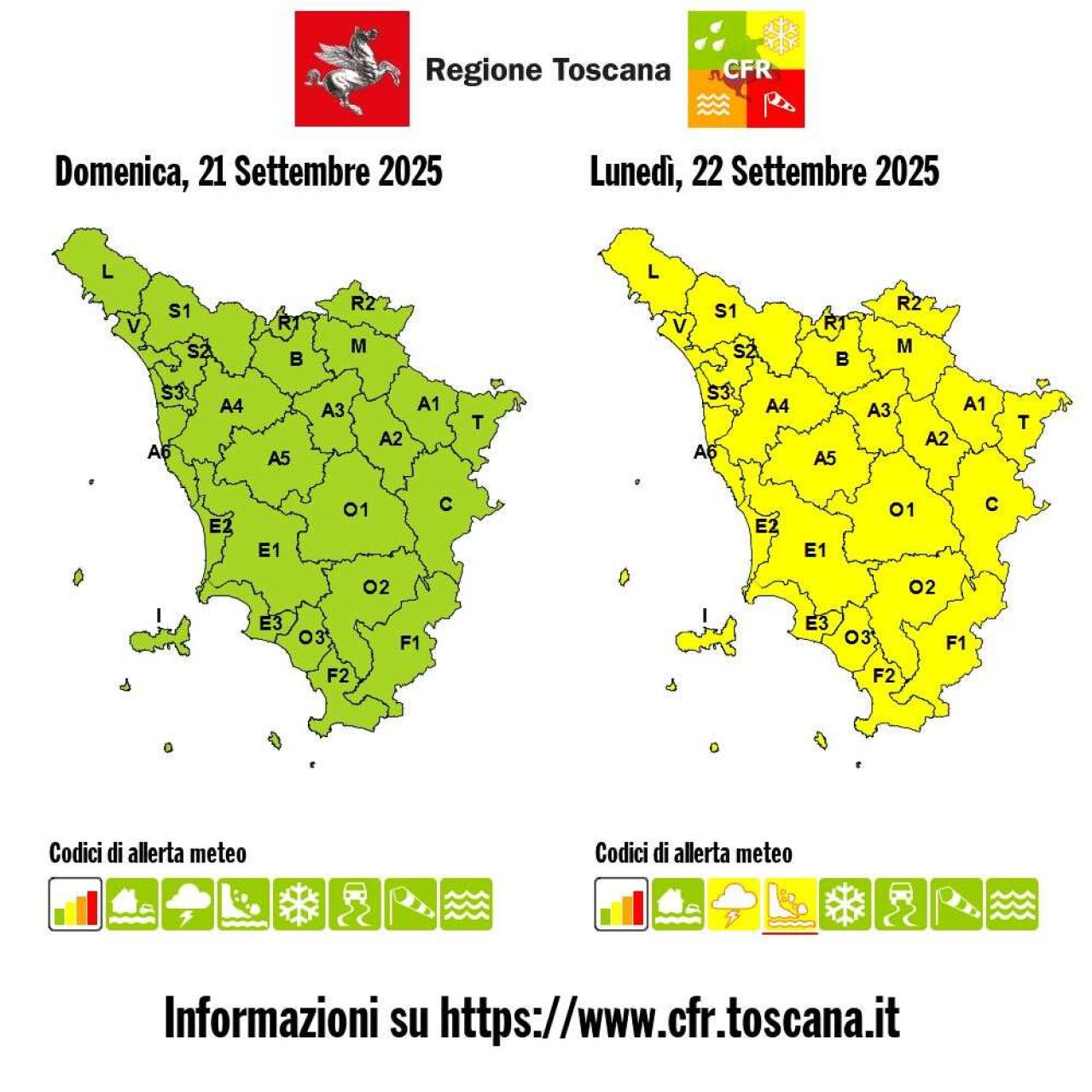 La Sala operativa unificata della Protezione civile toscana (Soup) ha appena diramato una nuova allerta meteo: un avviso di criticità gialla per rischio idrogeologico e idraulico del reticolo minore e per temporali forti che sarà in vigore nella giornata di domani, lunedì 22, dalle 7 fino alla mezzanotte sulla Toscana nord occidentale e dalle 12 fino alla mezzanotte sul resto della Toscana.