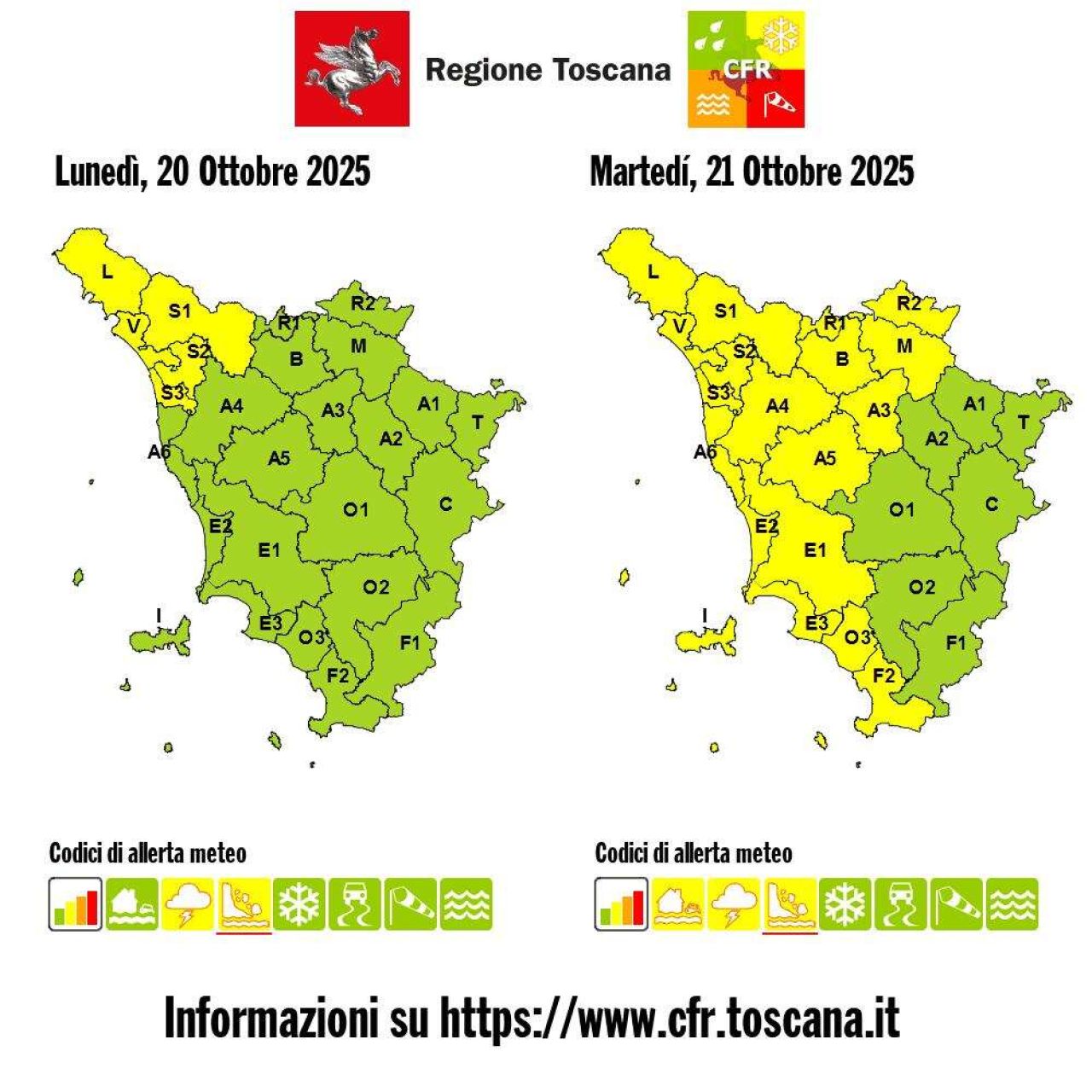 Nella notte di martedì le precipitazioni, anche temporalesche, si estenderanno a tutta la zona costiera e in successivo spostamento verso le aree più interne, dove il codice giallo sarà in vigore dalla mezzanotte fino alle ore 13 di domani, martedì 21 ottobre.