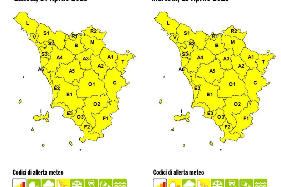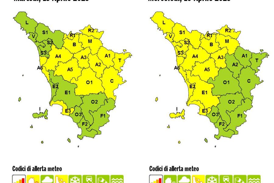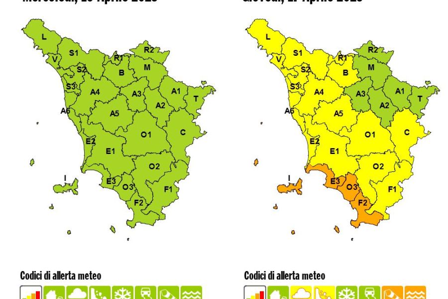 La Sala operativa unificata della Protezione civile toscana (Soup) ha diramato una nuova allerta meteo, con vari livelli di criticità per la giornata di domani, giovedì 17 aprile: codice arancione per vento forte e mareggiate su costa meridionale e Arcipelago (gialla sul resto della costa); allerta gialla per rischio idrogeologico su quasi tutta la regione; allerta gialla per temporali forti su costa meridionale e Arcipelago.